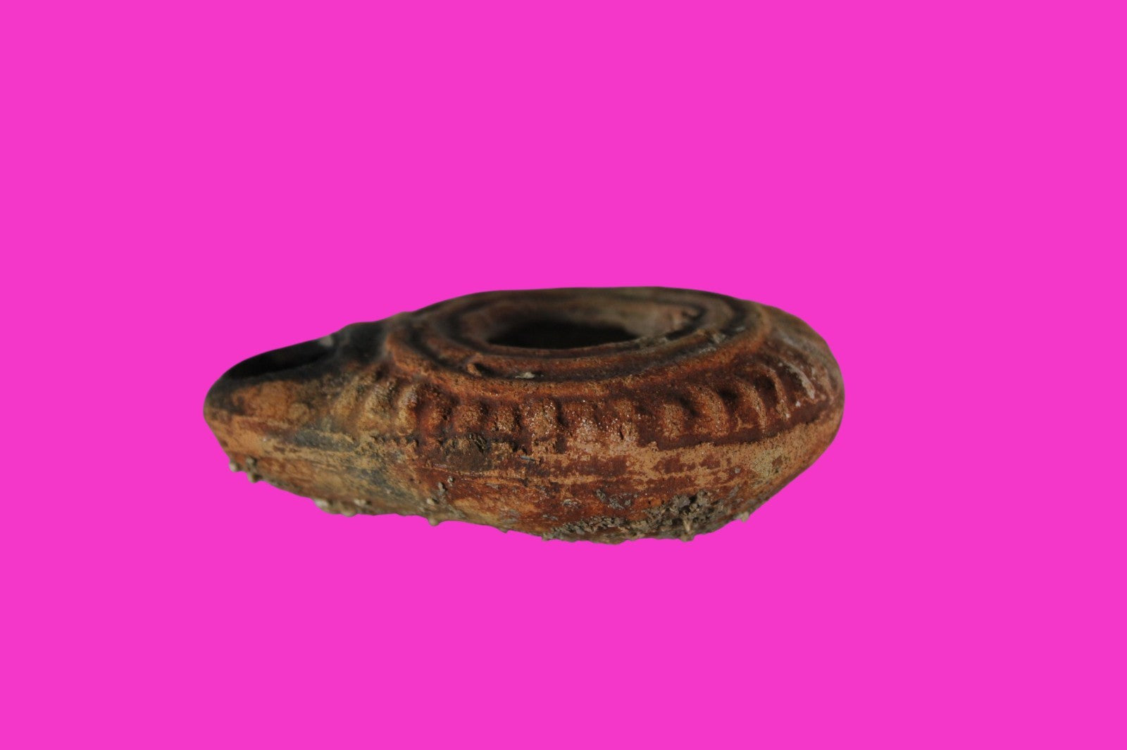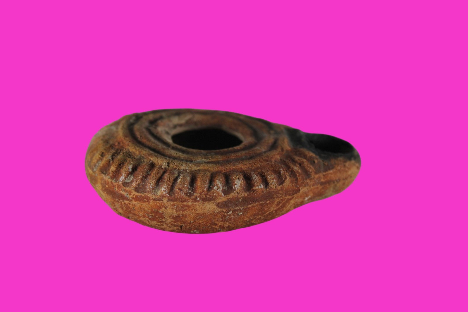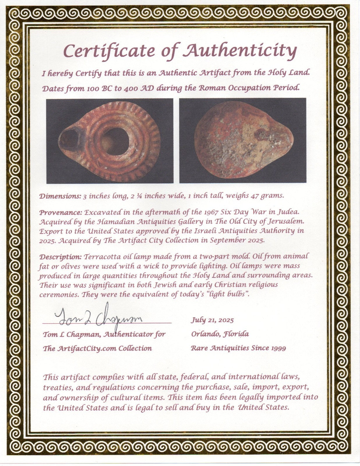 Dimensions: 3 inches long, 2 ¼ inches wide, 1 inch tall, weighs 47 grams. Provenance: Excavated in the aftermath of the 1967 Six Day War in Judea. Acquired by the Hamadian Antiquities Gallery in The Old City of Jerusalem. Export to the United States approved by the Israeli Antiquities Authority in 2025. Acquired by The Artifact City Collection in September 2025. Description: Terracotta oil lamp made from a two-part mold. Oil from animal fat or olives were used with a wick to provide lighting. Oil lamps were mass produced in large quantities throughout the Holy Land and surrounding areas. Their use was significant in both Jewish and early Christian religious ceremonies. They were the equivalent of today’s “light bulbs”.