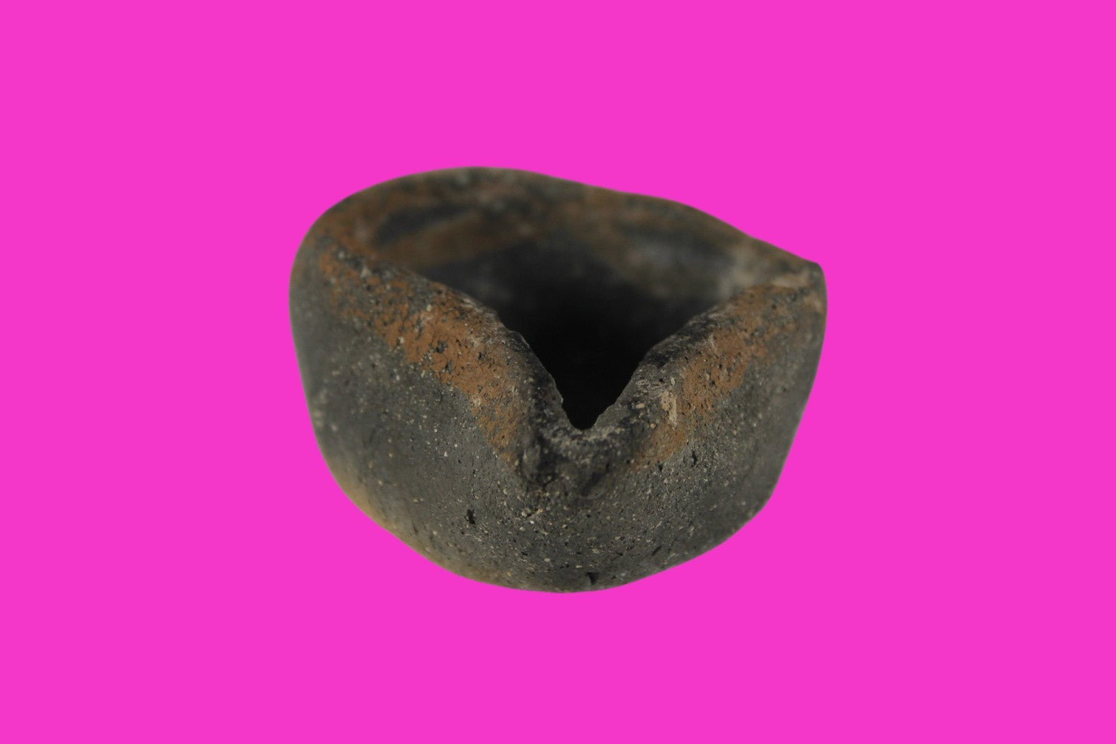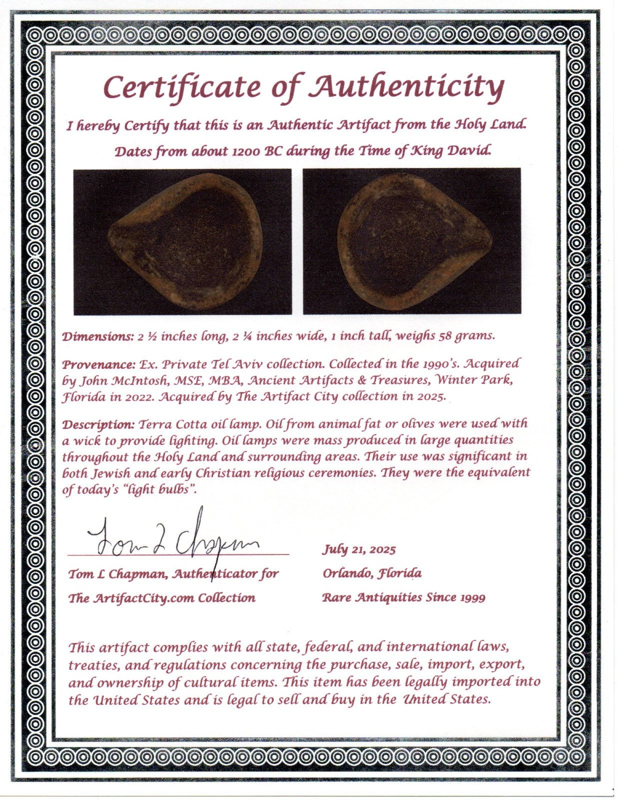 Dimensions: 3 inches long, 2 ¼ inches wide, ½ inch tall, weighs 38 grams. Provenance: Ex. Private Tel Aviv collection. Collected in the 1990’s. Acquired by John McIntosh, MSE, MBA, Ancient Artifacts & Treasures, Winter Park, Florida in 2022. Acquired by The Artifact City collection in 2025. Description: Terra Cotta oil lamp. Oil from animal fat or olives were used with a wick to provide lighting. Oil lamps were mass produced in large quantities throughout the Holy Land and surrounding areas. Their use was significant in both Jewish and early Christian religious ceremonies. They were the equivalent of today’s “light bulbs”.