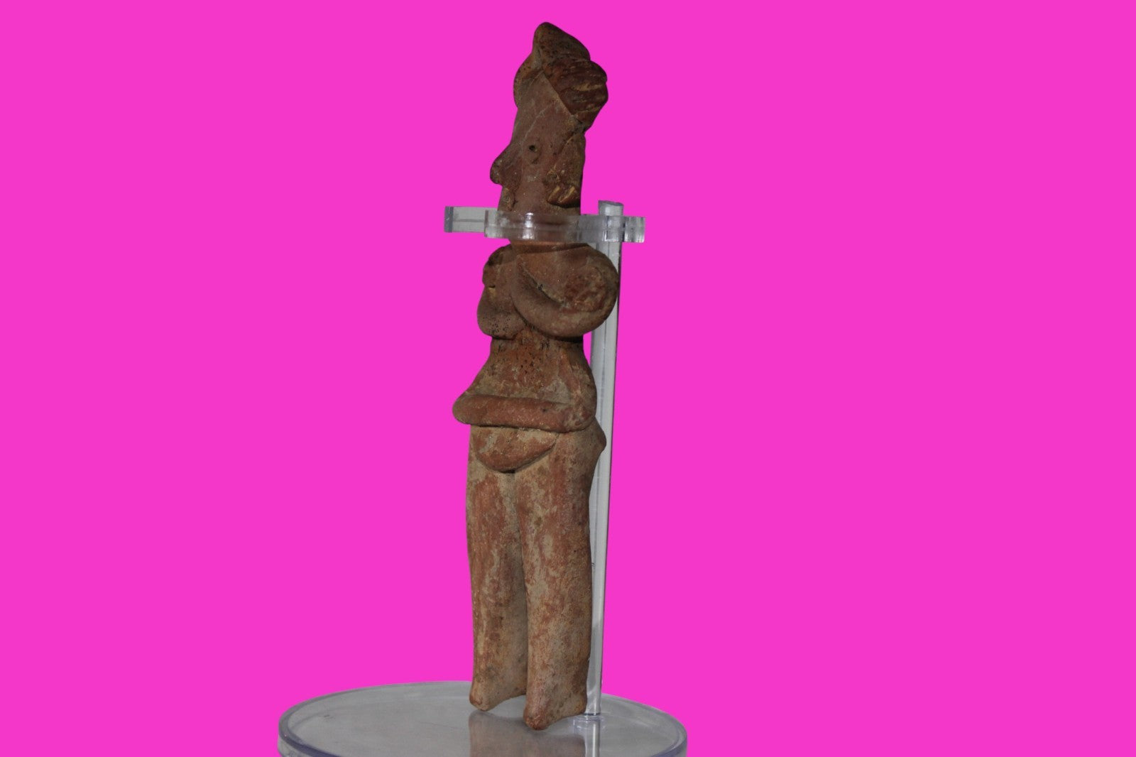 Dimensions: 6 inches tall, 2 ¼ inches wide, weighs 103 grams. History: The deceased were lowered tied to boards through long shafts into tombs where workers arranged the bodies in their final resting places, often alongside previously interred family members. Tomb figures were placed with the fallen to provide companionship, guidance, and protection in the afterlife. Description: Male Shaman figure, wearing headgear, ear ornaments, and a loin cloth. Right ear ornament damaged, nose chipped, reattached at the waste. Overall Good condition. Manganese Dioxide Reactivity Test Results: 40% hydrogen peroxide was applied to multiple manganese blooms that resulted in a chemical reaction confirming approximately 2000 years of underground burial. Provenance: Ex. Private Nevada collection. Ex. Dr. David Harner collection, Arkansas, 1950’s -1960’s.Ex. Arte Primitivo Fine Art Gallery, February 2025. Acquired by The Artifact City Collection in 2025.