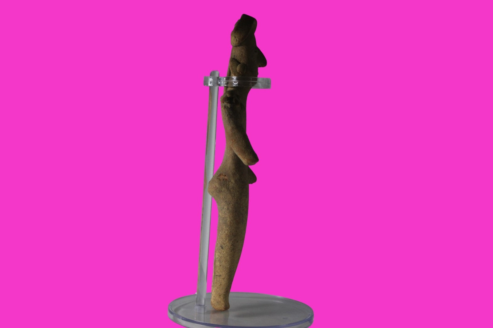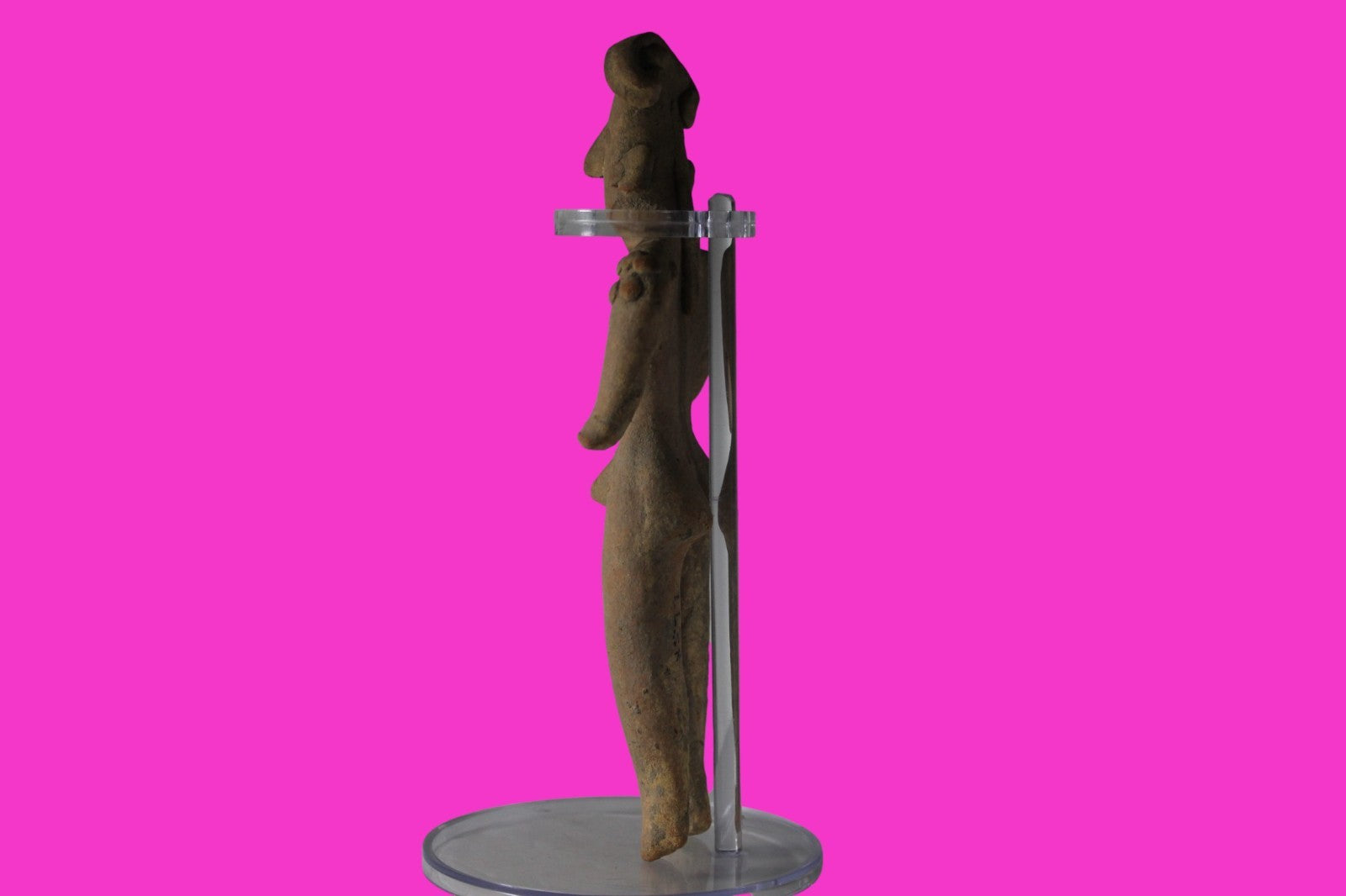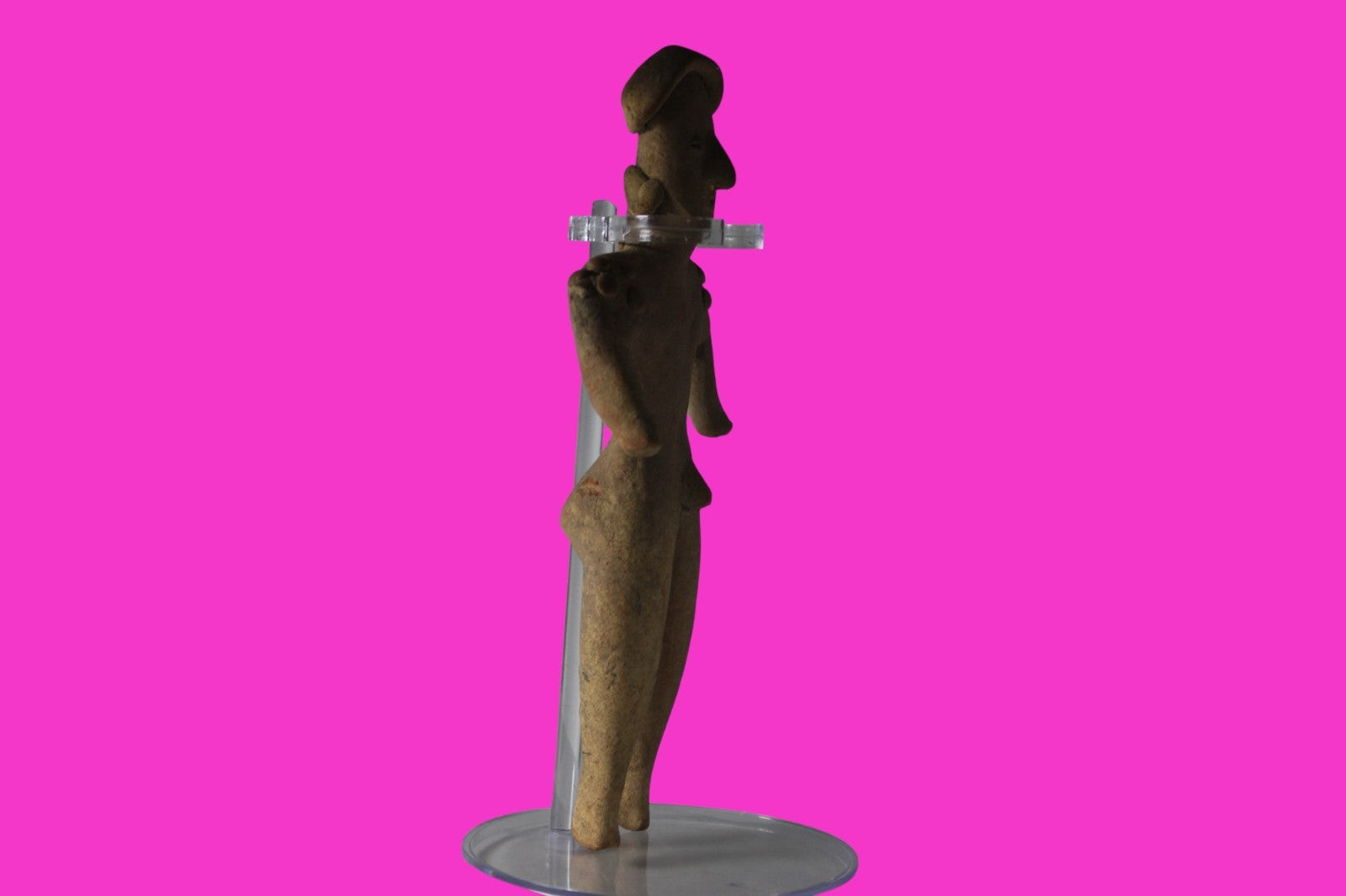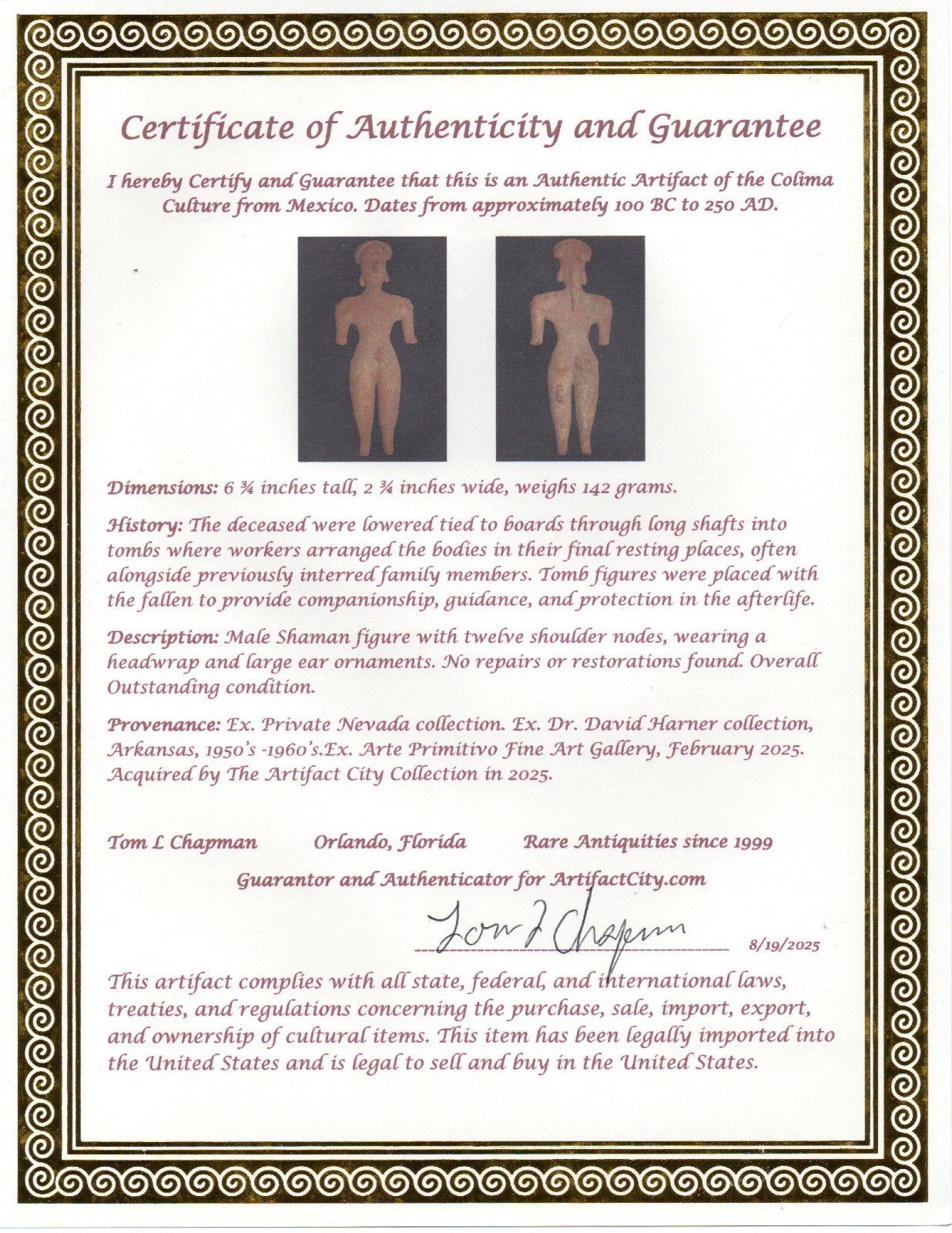 Dimensions: 6 ¾ inches tall, 2 ¾ inches wide, weighs 142 grams. History: The deceased were lowered tied to boards through long shafts into tombs where workers arranged the bodies in their final resting places, often alongside previously interred family members. Tomb figures were placed with the fallen to provide companionship, guidance, and protection in the afterlife. Description: Male Shaman figure with twelve shoulder nodes, wearing a headwrap and large ear ornaments. No repairs or restorations found. Overall Outstanding condition. Provenance: Ex. Private Nevada collection. Ex. Dr. David Harner collection, Arkansas, 1950’s -1960’s.Ex. Arte Primitivo Fine Art Gallery, February 2025. Acquired by The Artifact City Collection in 2025.
