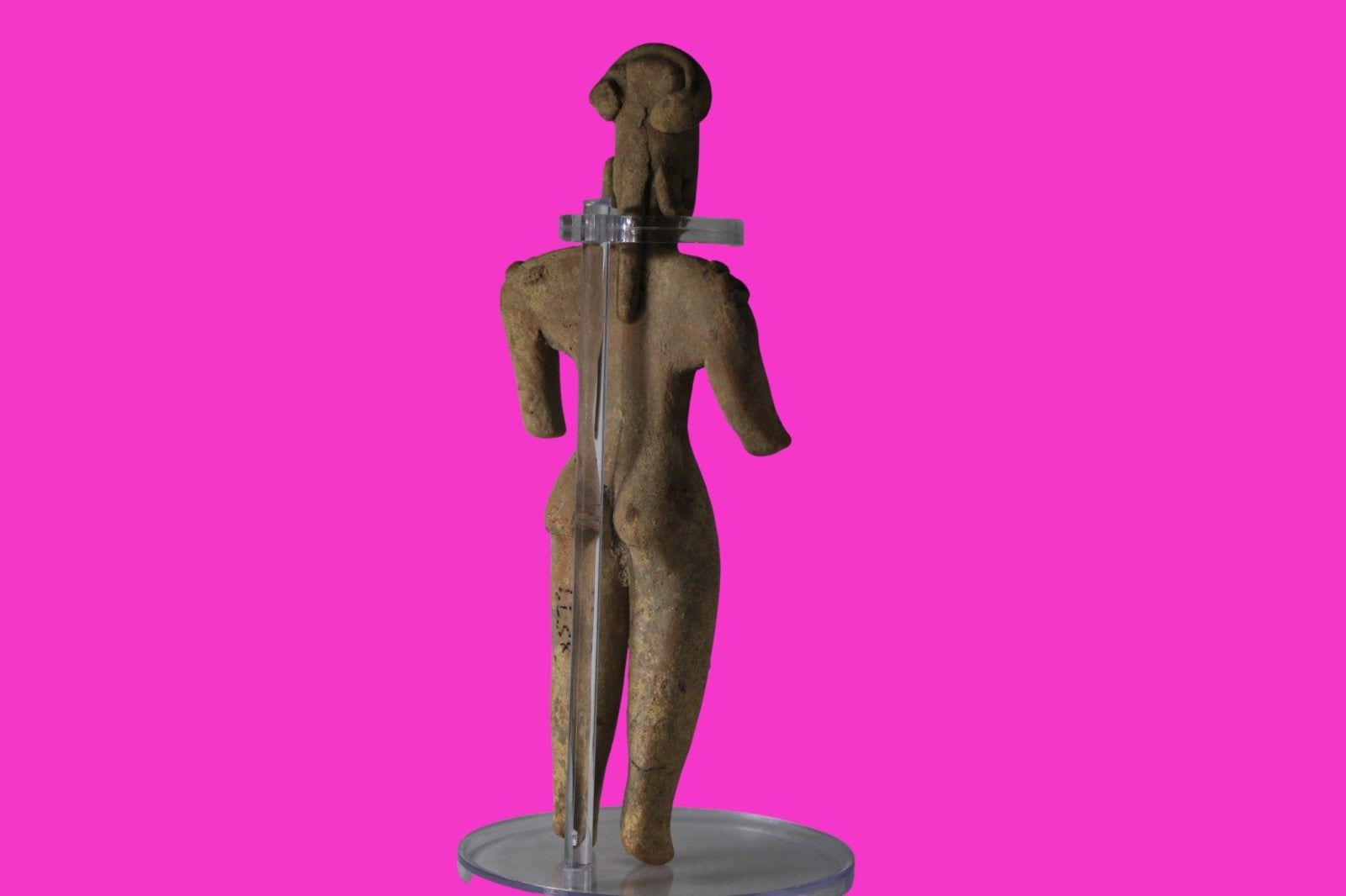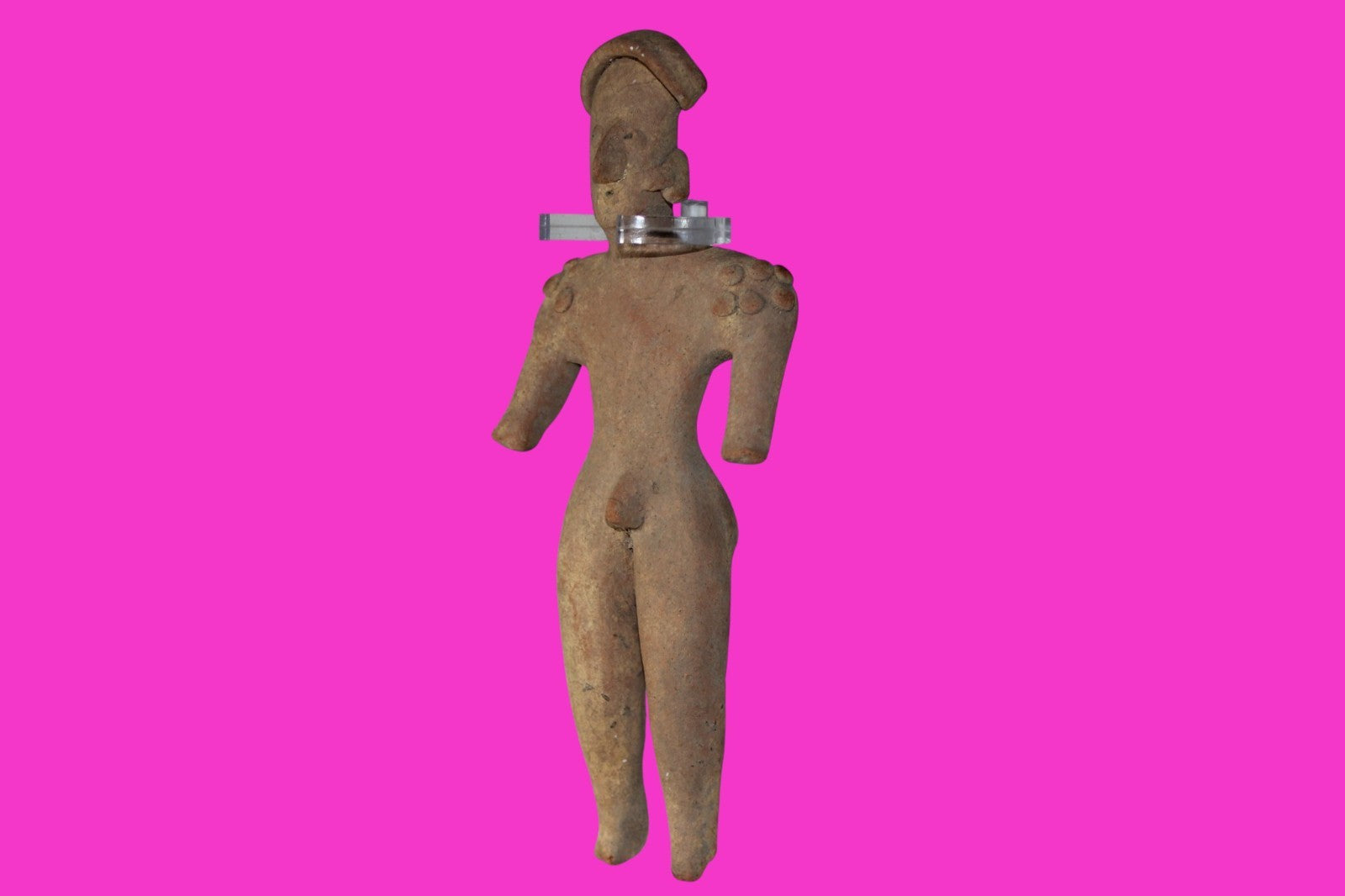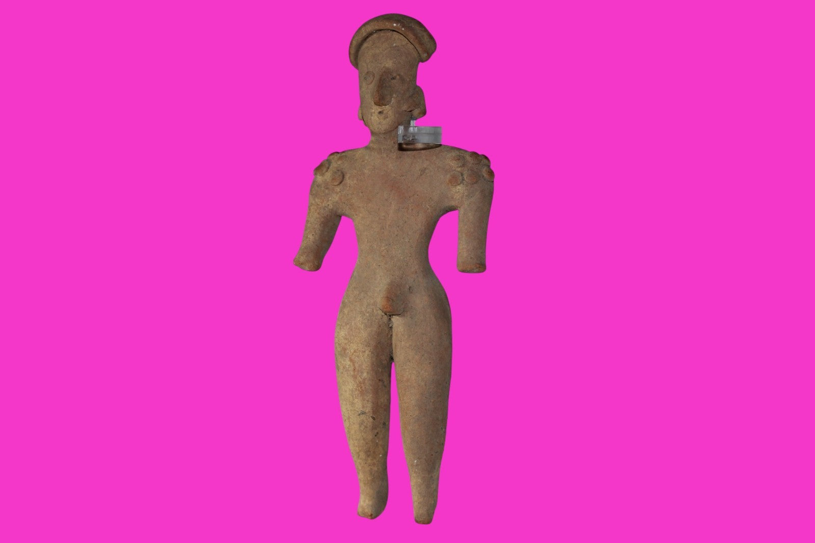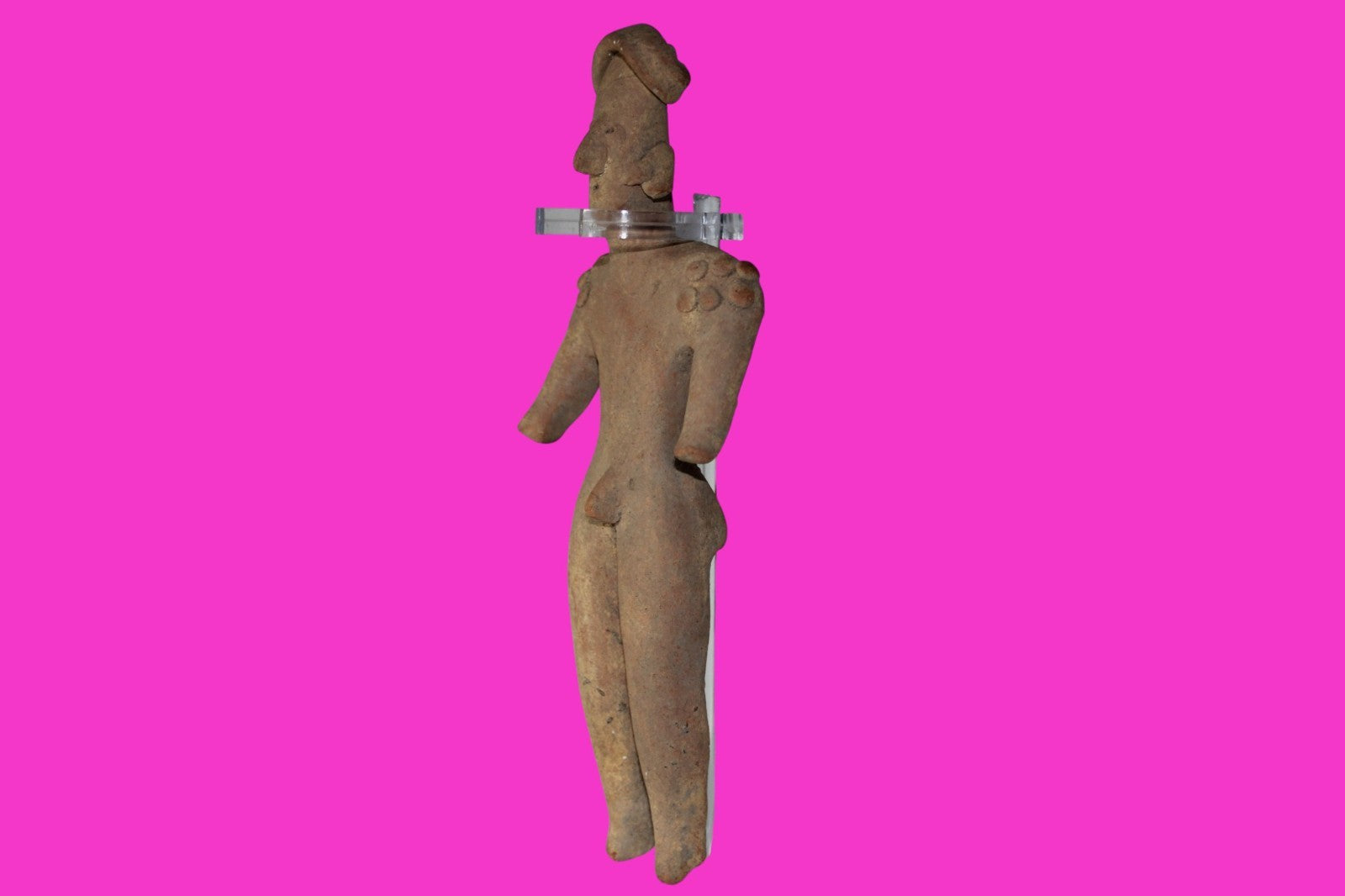 Dimensions: 6 ¾ inches tall, 2 ¾ inches wide, weighs 142 grams. History: The deceased were lowered tied to boards through long shafts into tombs where workers arranged the bodies in their final resting places, often alongside previously interred family members. Tomb figures were placed with the fallen to provide companionship, guidance, and protection in the afterlife. Description: Male Shaman figure with twelve shoulder nodes, wearing a headwrap and large ear ornaments. No repairs or restorations found. Overall Outstanding condition. Provenance: Ex. Private Nevada collection. Ex. Dr. David Harner collection, Arkansas, 1950’s -1960’s.Ex. Arte Primitivo Fine Art Gallery, February 2025. Acquired by The Artifact City Collection in 2025.