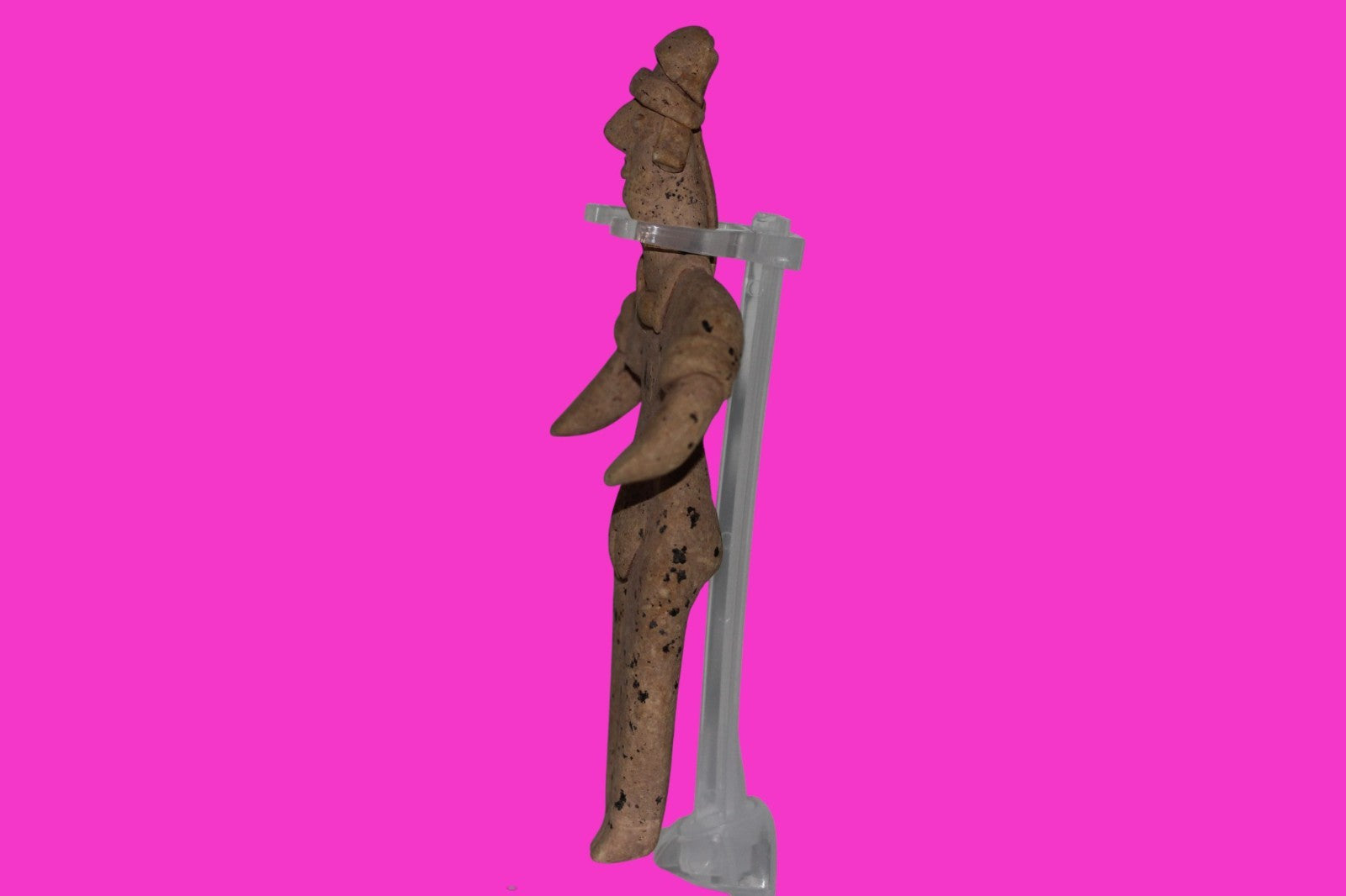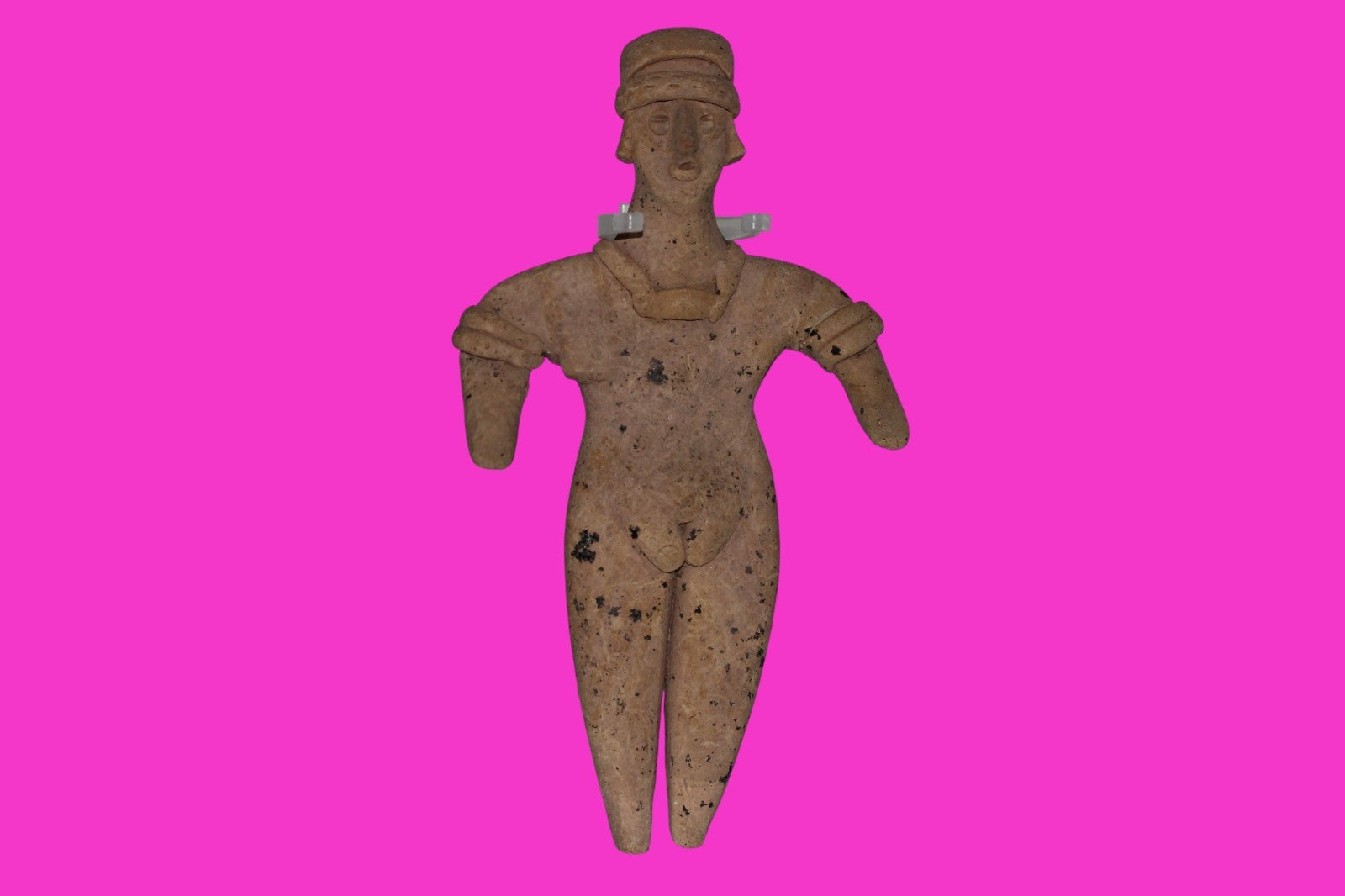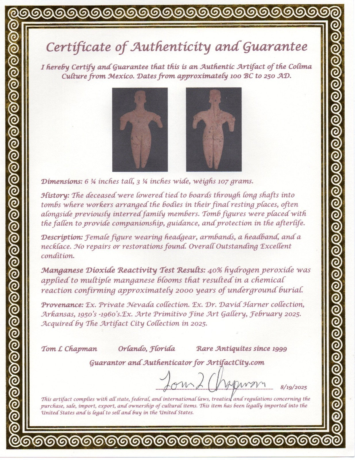 Dimensions: 6 ¼ inches tall, 3 ¼ inches wide, weighs 107 grams. History: The deceased were lowered tied to boards through long shafts into tombs where workers arranged the bodies in their final resting places, often alongside previously interred family members. Tomb figures were placed with the fallen to provide companionship, guidance, and protection in the afterlife. Description: Female figure wearing headgear, armbands, a headband, and a necklace. No repairs or restorations found. Overall Outstanding Excellent condition. Manganese Dioxide Reactivity Test Results: 40% hydrogen peroxide was applied to multiple manganese blooms that resulted in a chemical reaction confirming approximately 2000 years of underground burial. Provenance: Ex. Private Nevada collection. Ex. Dr. David Harner collection, Arkansas, 1950’s -1960’s.Ex. Arte Primitivo Fine Art Gallery, February 2025. Acquired by The Artifact City Collection in 2025.