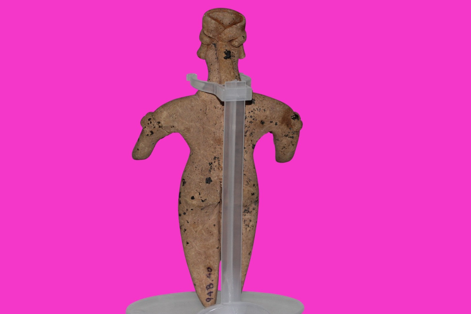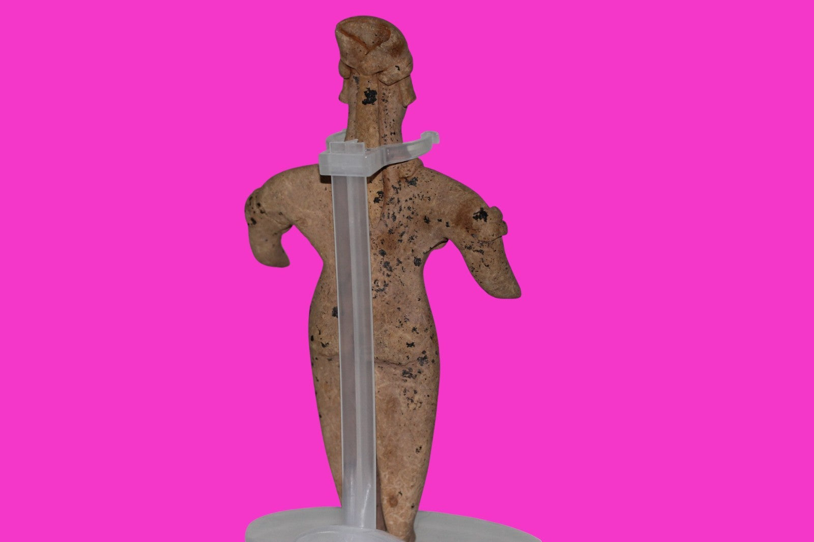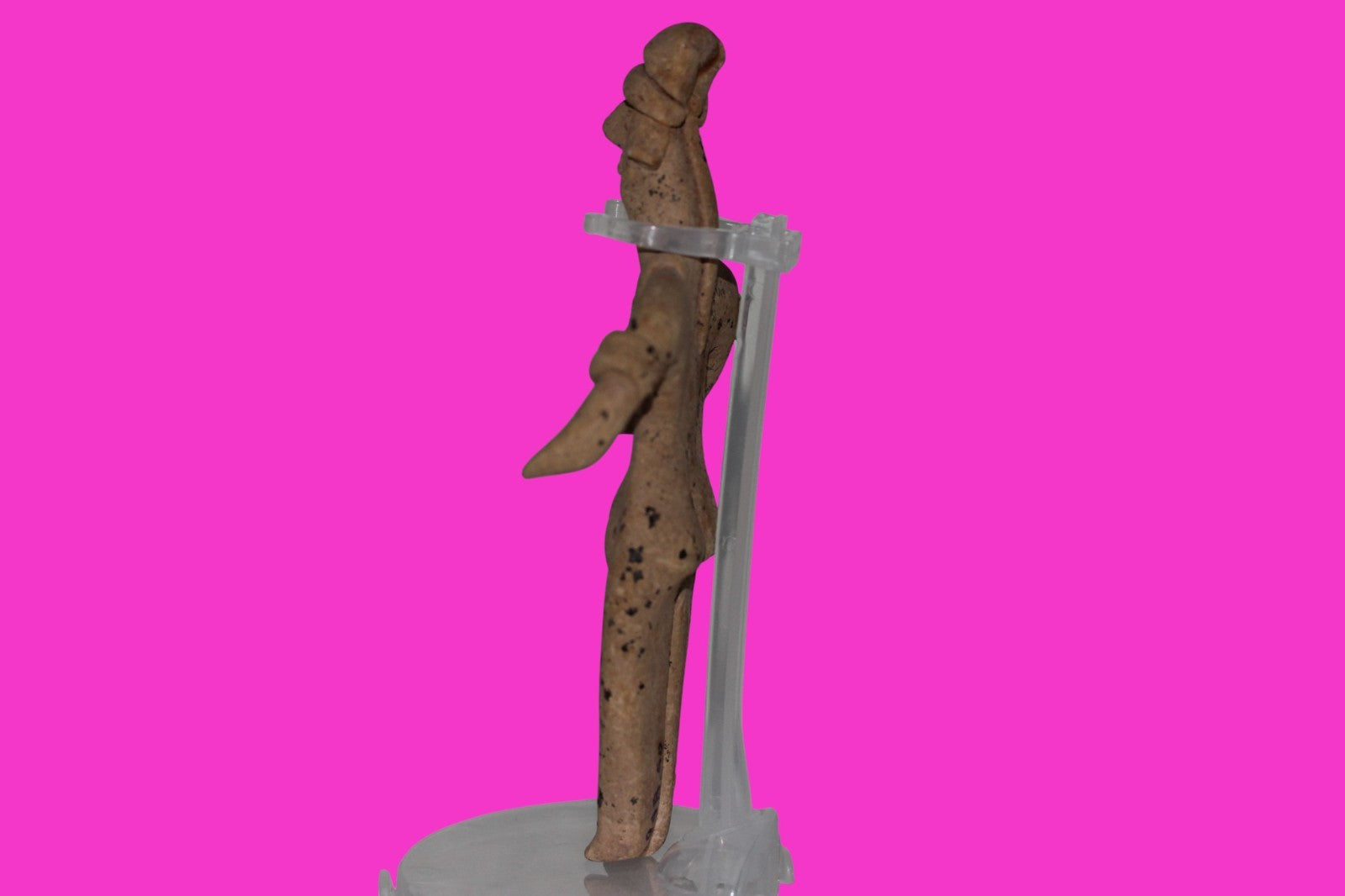 Dimensions: 6 ¼ inches tall, 3 ¼ inches wide, weighs 107 grams. History: The deceased were lowered tied to boards through long shafts into tombs where workers arranged the bodies in their final resting places, often alongside previously interred family members. Tomb figures were placed with the fallen to provide companionship, guidance, and protection in the afterlife. Description: Female figure wearing headgear, armbands, a headband, and a necklace. No repairs or restorations found. Overall Outstanding Excellent condition. Manganese Dioxide Reactivity Test Results: 40% hydrogen peroxide was applied to multiple manganese blooms that resulted in a chemical reaction confirming approximately 2000 years of underground burial. Provenance: Ex. Private Nevada collection. Ex. Dr. David Harner collection, Arkansas, 1950’s -1960’s.Ex. Arte Primitivo Fine Art Gallery, February 2025. Acquired by The Artifact City Collection in 2025.
