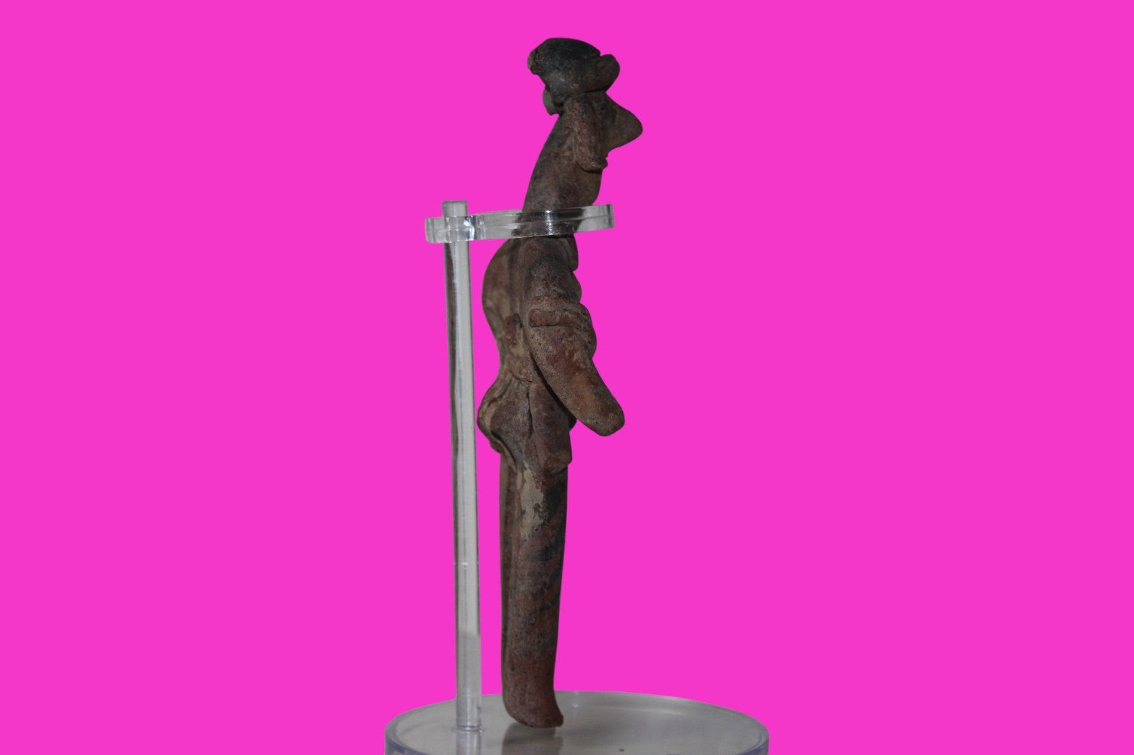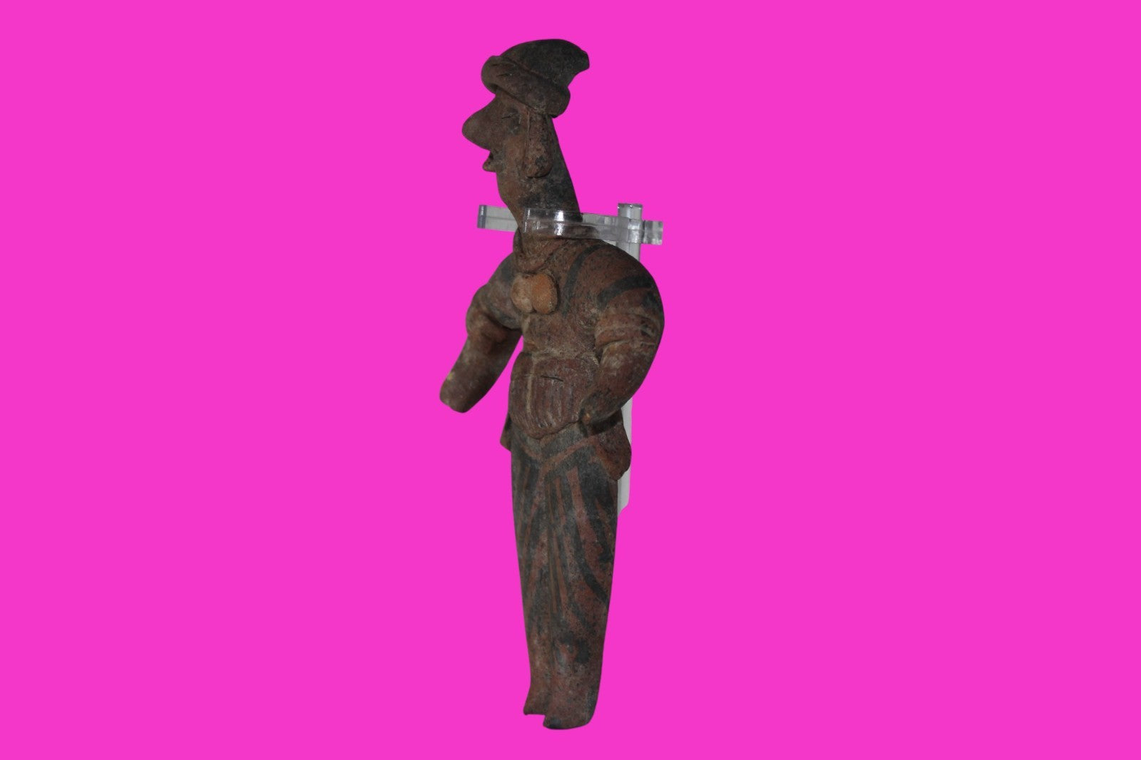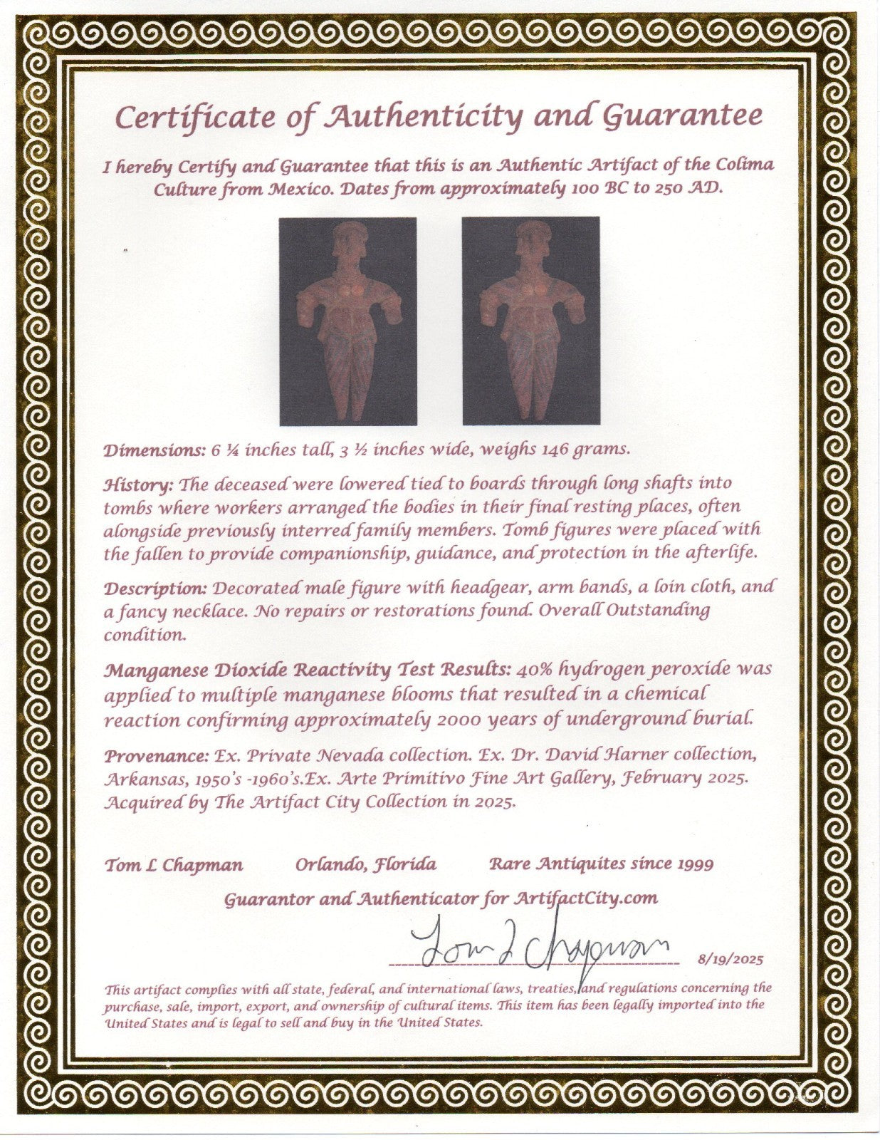 Dimensions: 6 ¼ inches tall, 3 ½ inches wide, weighs 146 grams. History: The deceased were lowered tied to boards through long shafts into tombs where workers arranged the bodies in their final resting places, often alongside previously interred family members. Tomb figures were placed with the fallen to provide companionship, guidance, and protection in the afterlife. Description: Decorated male figure with headgear, arm bands, a loin cloth, and a fancy necklace. No repairs or restorations found. Overall Outstanding condition. Manganese Dioxide Reactivity Test Results: 40% hydrogen peroxide was applied to multiple manganese blooms that resulted in a chemical reaction confirming approximately 2000 years of underground burial. Provenance: Ex. Private Nevada collection. Ex. Dr. David Harner collection, Arkansas, 1950’s -1960’s.Ex. Arte Primitivo Fine Art Gallery, February 2025. Acquired by The Artifact City Collection in 2025.