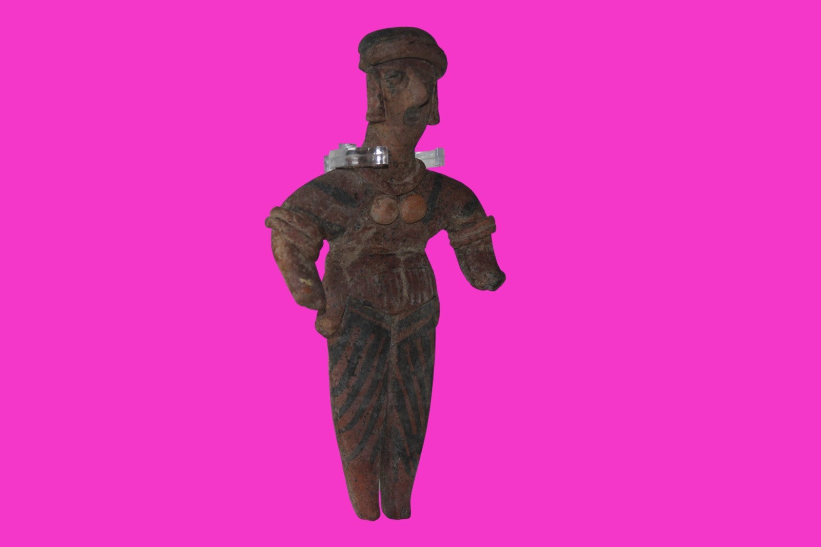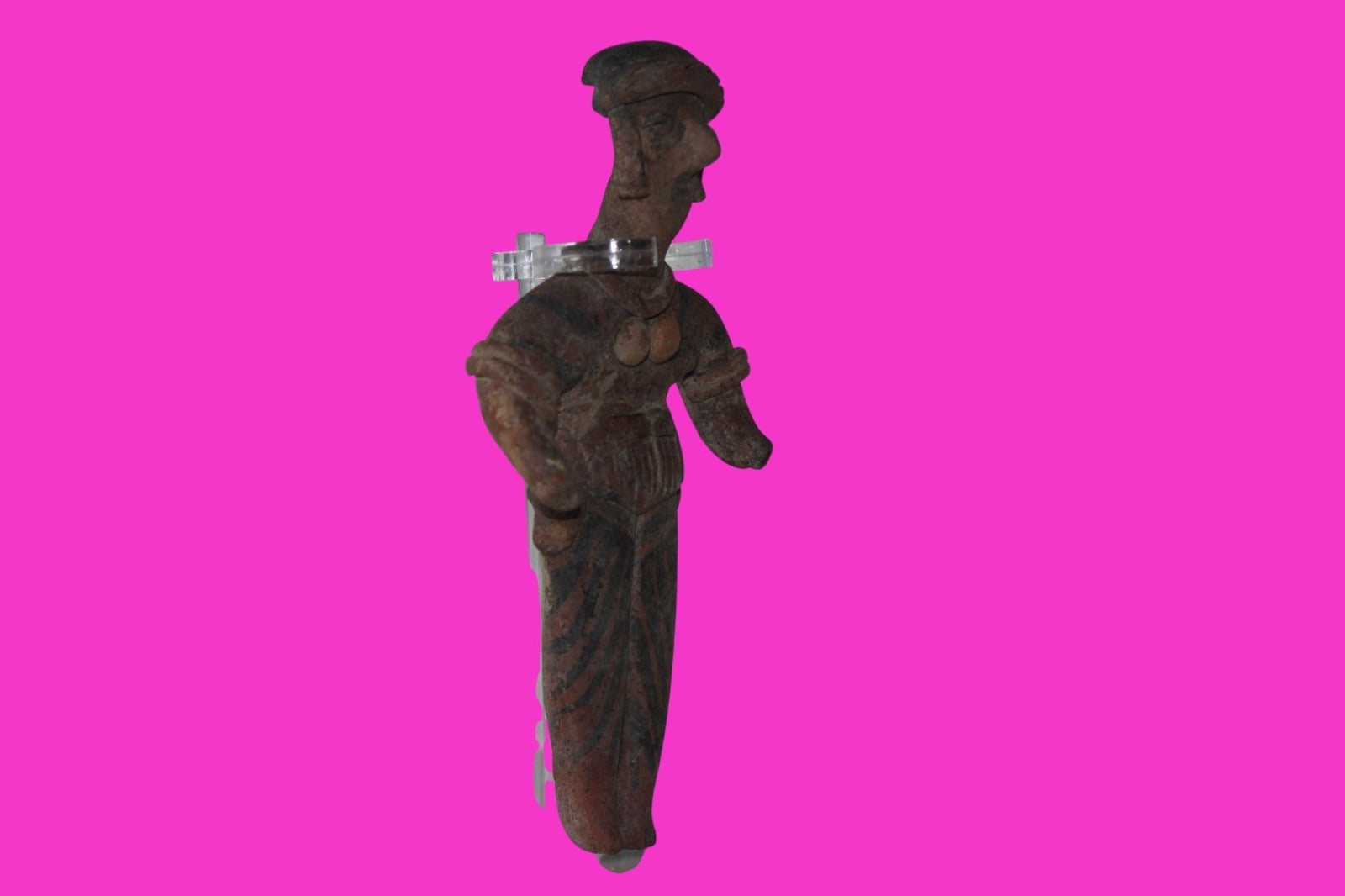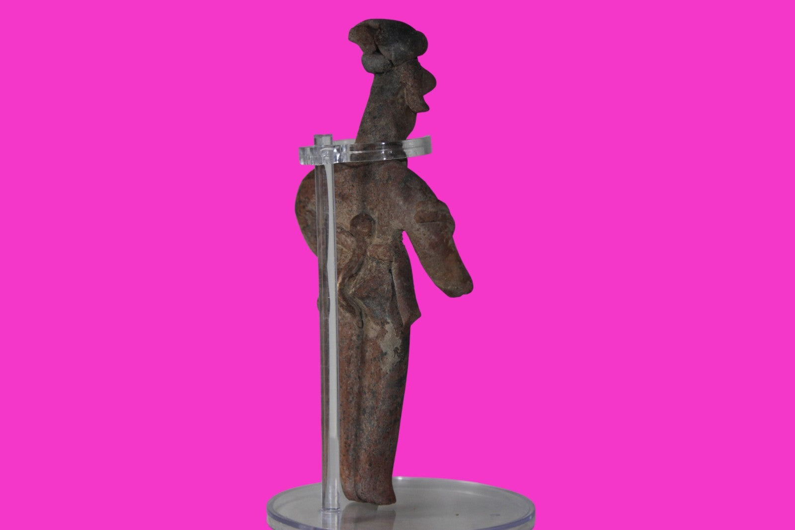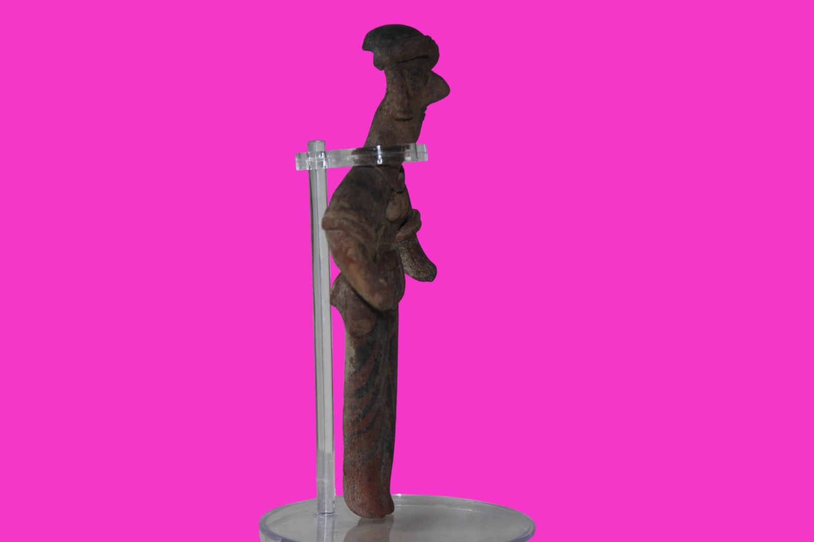 Dimensions: 6 ¼ inches tall, 3 ½ inches wide, weighs 146 grams. History: The deceased were lowered tied to boards through long shafts into tombs where workers arranged the bodies in their final resting places, often alongside previously interred family members. Tomb figures were placed with the fallen to provide companionship, guidance, and protection in the afterlife. Description: Decorated male figure with headgear, arm bands, a loin cloth, and a fancy necklace. No repairs or restorations found. Overall Outstanding condition. Manganese Dioxide Reactivity Test Results: 40% hydrogen peroxide was applied to multiple manganese blooms that resulted in a chemical reaction confirming approximately 2000 years of underground burial. Provenance: Ex. Private Nevada collection. Ex. Dr. David Harner collection, Arkansas, 1950’s -1960’s.Ex. Arte Primitivo Fine Art Gallery, February 2025. Acquired by The Artifact City Collection in 2025.