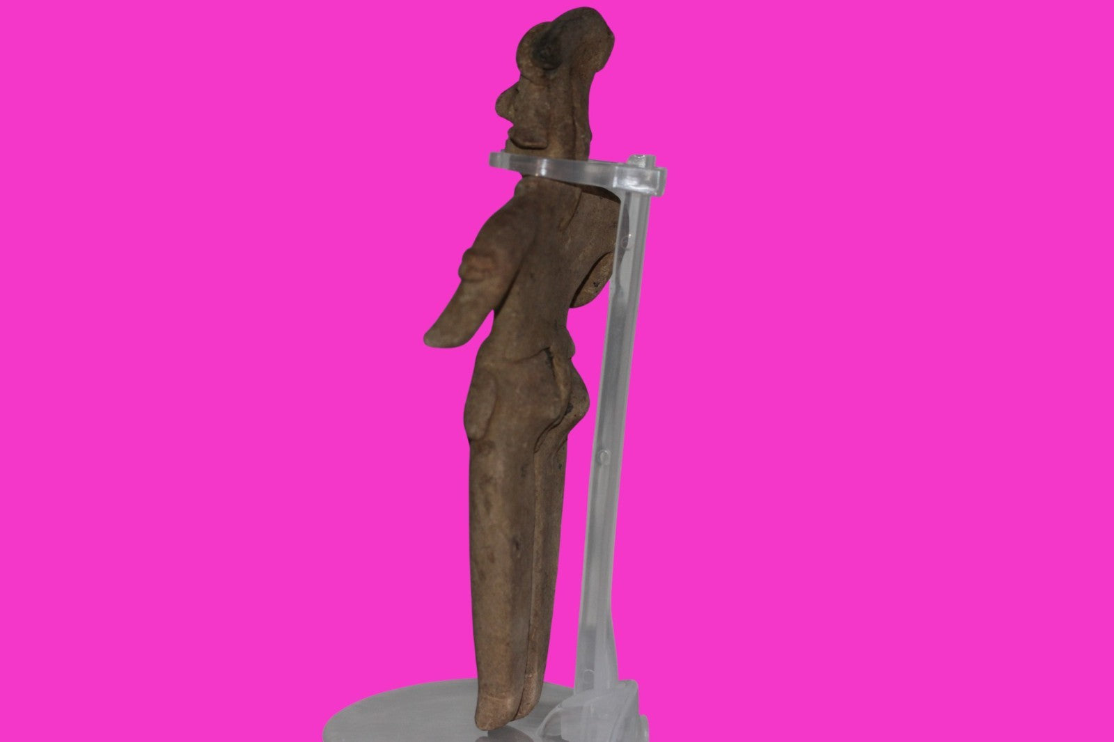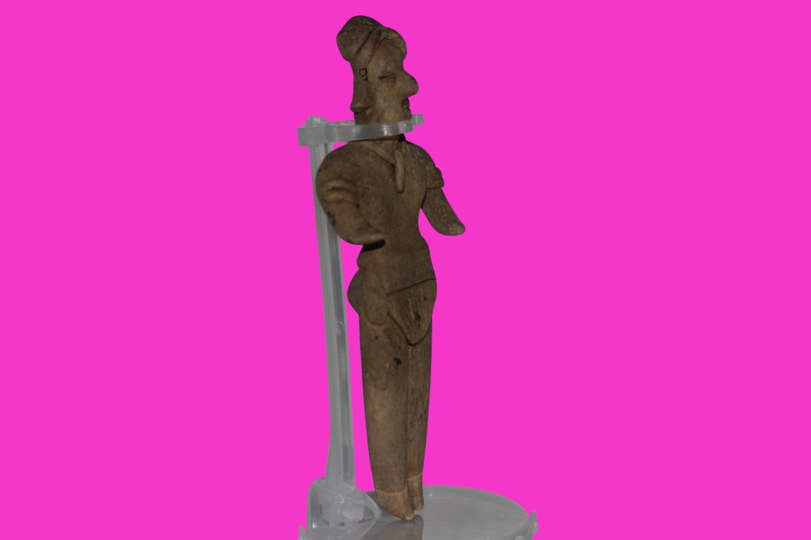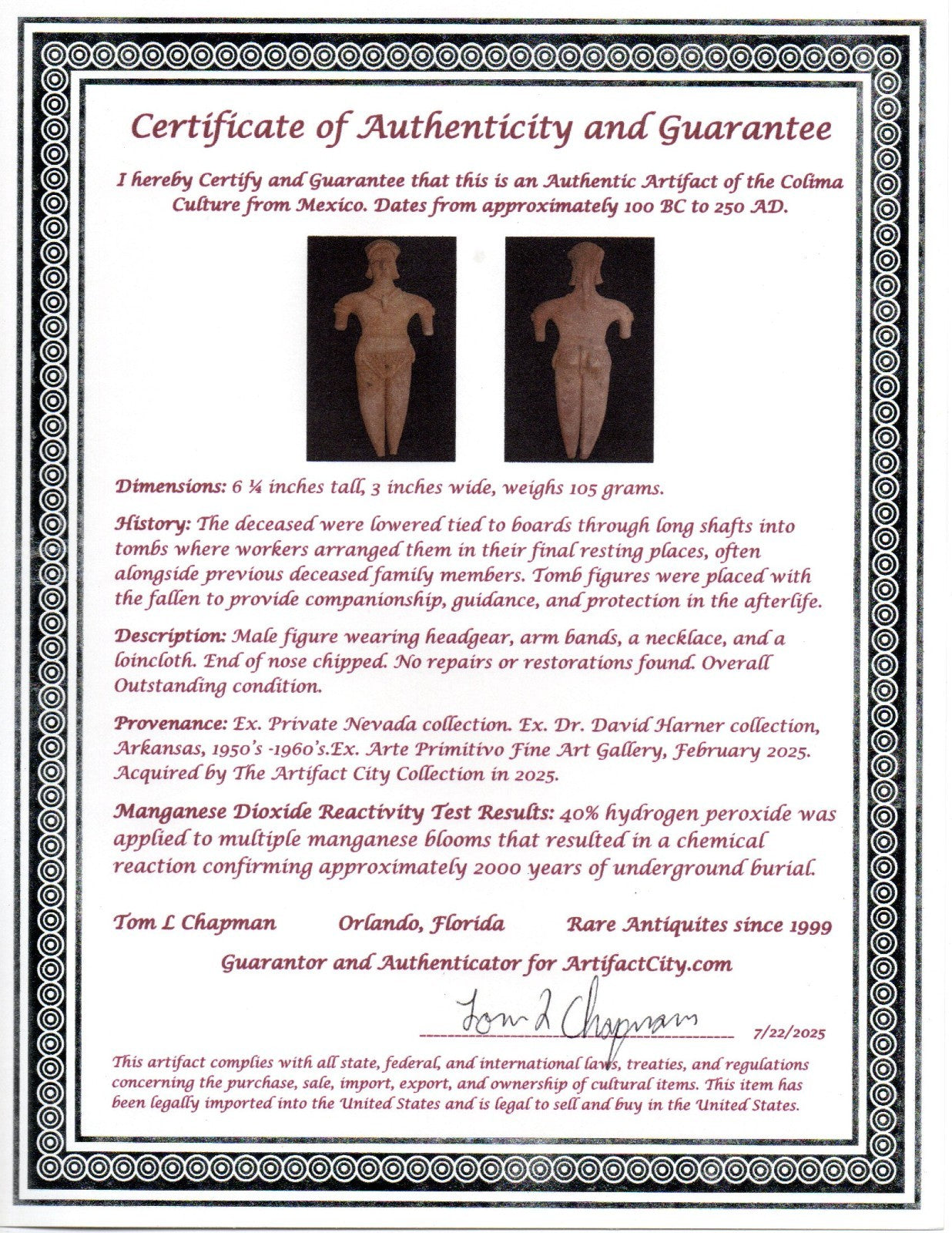 Dimensions: 6 ¼ inches tall, 3 inches wide, weighs 105 grams. History: The deceased were lowered tied to boards through long shafts into tombs where workers arranged them in their final resting places, often alongside previous deceased family members. Tomb figures were placed with the fallen to provide companionship, guidance, and protection in the afterlife. Description: Male figure wearing headgear, arm bands, a necklace, and a loincloth. End of nose chipped. No repairs or restorations found. Overall Outstanding condition. Provenance: Ex. Private Nevada collection. Ex. Dr. David Harner collection, Arkansas, 1950’s -1960’s.Ex. Arte Primitivo Fine Art Gallery, February 2025. Acquired by The Artifact City Collection in 2025. Manganese Dioxide Reactivity Test Results: 40% hydrogen peroxide was applied to multiple manganese blooms that resulted in a chemical reaction confirming approximately 2000 years of underground burial.