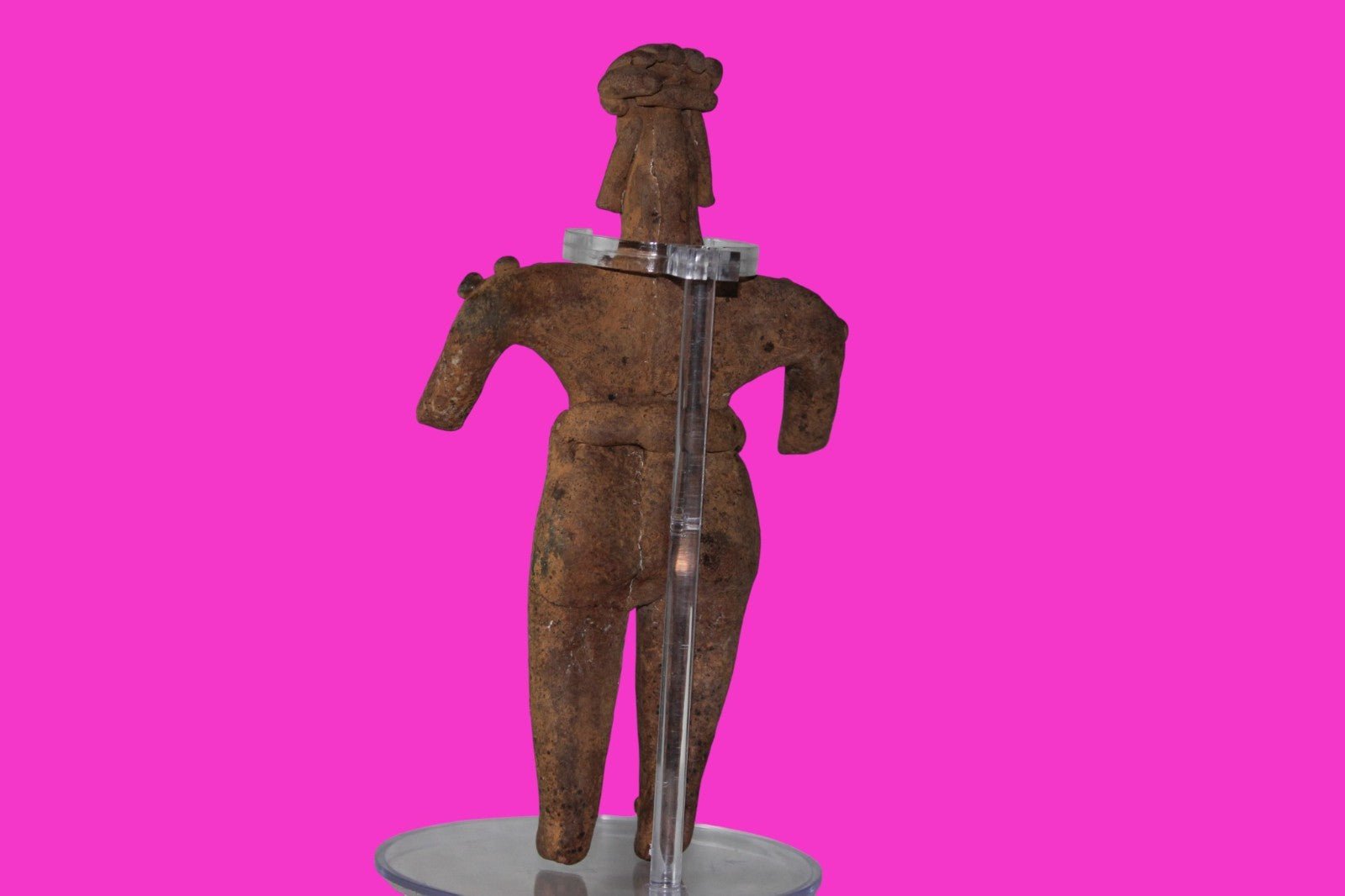 Dimensions: 6 ¼ inches tall, 3 ½ inches wide, weighs 149 grams. History: The deceased were lowered tied to boards through long shafts into tombs where workers arranged the bodies in their final resting places, often alongside previously interred family members. Tomb figures were placed with the fallen to provide companionship, guidance, and protection in the afterlife. Description: Female Shaman figure with ten shoulder nodes, wearing headgear with tassels, a fancy necklace, and a loin cloth. Left leg reattached and end of nose chipped, otherwise intact. Overall Outstanding condition. Manganese Dioxide Reactivity Test Results: 40% hydrogen peroxide was applied to multiple manganese blooms that resulted in a chemical reaction confirming approximately 2000 years of underground burial.Provenance: Ex. Private Nevada collection. Ex. Dr. David Harner collection, Arkansas, 1950’s -1960’s.Ex. Arte Primitivo Fine Art Gallery, February 2025. Acquired by The Artifact City Collection in 2025.