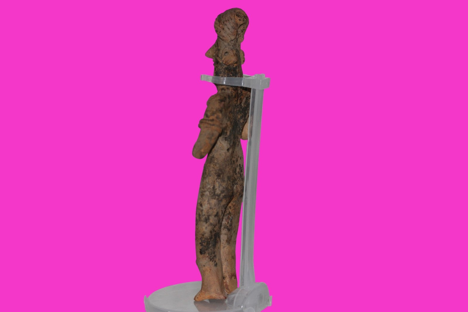 Dimensions: 7 ¼ inches tall, 3 ½ inches wide, weighs 187 grams. History: The deceased were lowered tied to boards through long shafts into tombs where workers arranged the bodies in their final resting places, often alongside previously interred family members. Tomb figures were placed with the fallen to provide companionship, guidance, and protection in the afterlife. Description: Female figure with decorated shoulders, wearing headgear, armbands and a necklace. No repairs or restorations found. Overall Outstanding Excellent condition. Manganese Dioxide Reactivity Test Results: 40% hydrogen peroxide was applied to multiple manganese blooms that resulted in a chemical reaction confirming approximately 2000 years of underground burial. Provenance: Ex. Private Nevada collection. Ex. Dr. David Harner collection, Arkansas, 1950’s -1960’s.Ex. Arte Primitivo Fine Art Gallery, February 2025. Acquired by The Artifact City Collection in 2025.