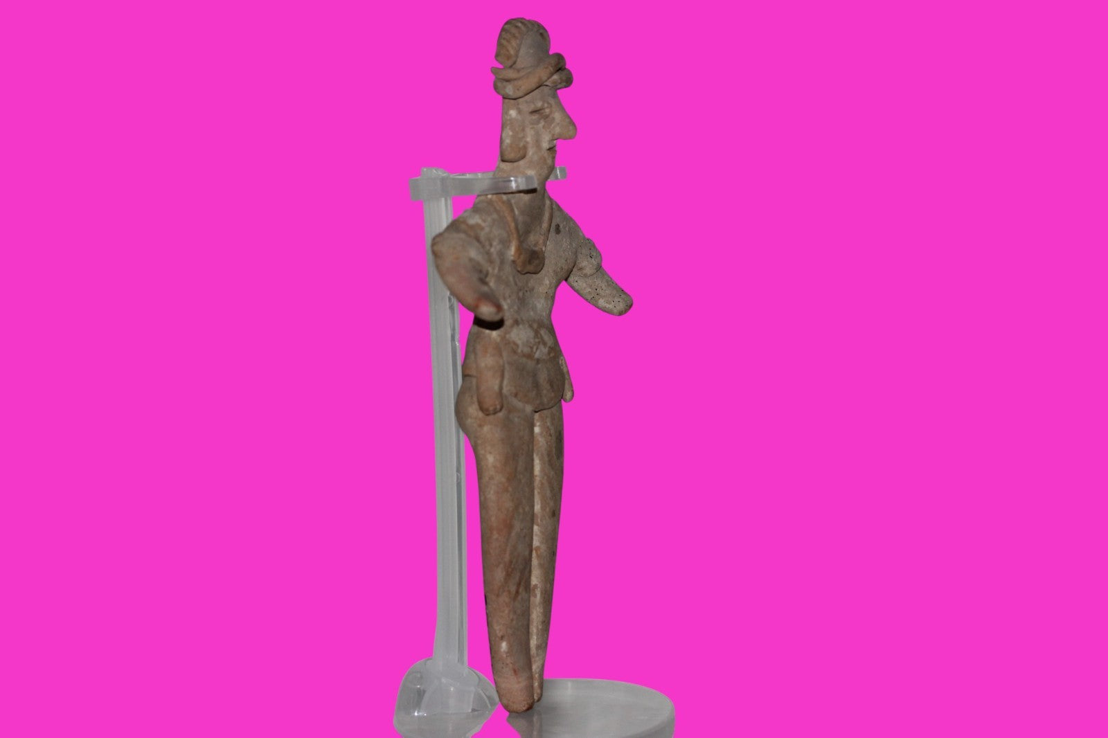 Dimensions: 7 ¼ inches tall, 3 ¾ inches wide, weighs 142 grams. History: The deceased were lowered tied to boards through long shafts into tombs where workers arranged the bodies in their final resting places, often alongside previously interred family members. Tomb figures were placed with the fallen to provide companionship, guidance, and protection in the afterlife. Description: Figure wearing elaborate headgear, armbands, a headband, a necklace, and a loincloth. No repairs or restorations found. Overall Outstanding Excellent condition. Manganese Dioxide Reactivity Test Results: 40% hydrogen peroxide was applied to multiple manganese blooms that resulted in a chemical reaction confirming approximately 2000 years of underground burial. Provenance: Ex. Private Nevada collection. Ex. Dr. David Harner collection, Arkansas, 1950’s -1960’s.Ex. Arte Primitivo Fine Art Gallery, February 2025. Acquired by The Artifact City Collection in 2025.