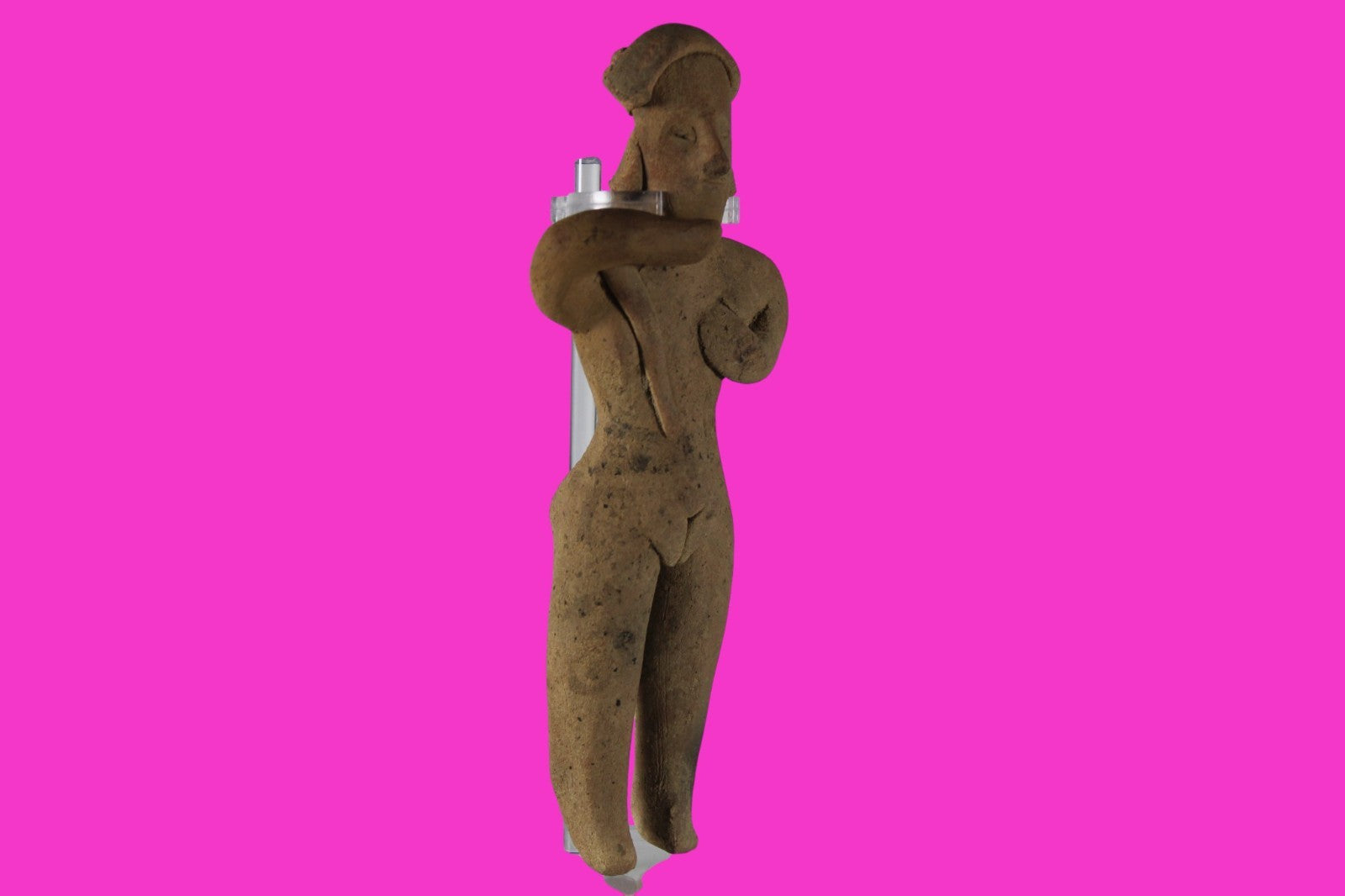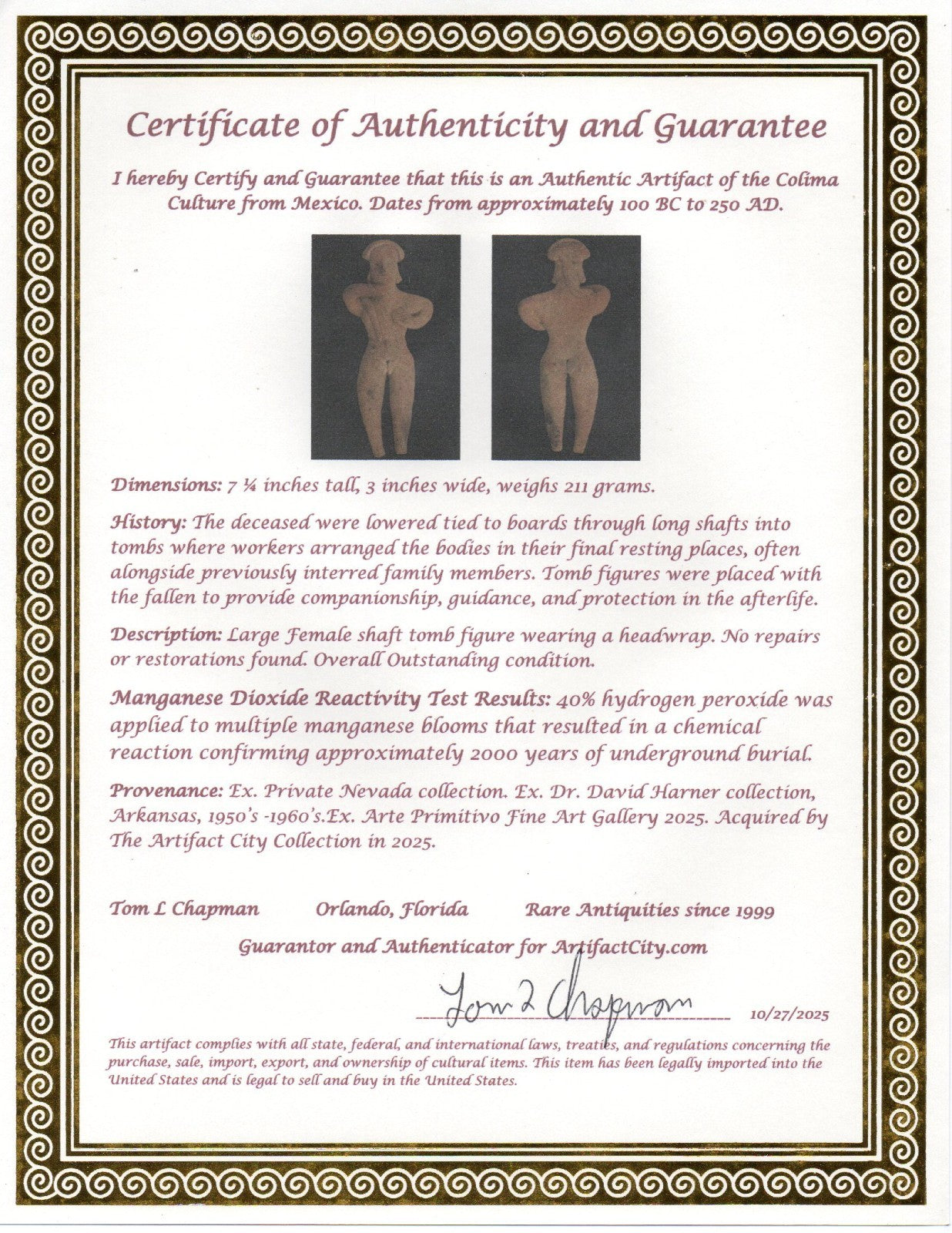 Dimensions: 7 ¼ inches tall, 3 inches wide, weighs 211 grams. History: The deceased were lowered tied to boards through long shafts into tombs where workers arranged the bodies in their final resting places, often alongside previously interred family members. Tomb figures were placed with the fallen to provide companionship, guidance, and protection in the afterlife. Description: Large Female shaft tomb figure wearing a headwrap. No repairs or restorations found. Overall Outstanding condition.Manganese Dioxide Reactivity Test Results: 40% hydrogen peroxide was applied to multiple manganese blooms that resulted in a chemical reaction confirming approximately 2000 years of underground burial. Provenance: Ex. Private Nevada collection. Ex. Dr. David Harner collection, Arkansas, 1950’s -1960’s.Ex. Arte Primitivo Fine Art Gallery 2025. Acquired by The Artifact City Collection in 2025.