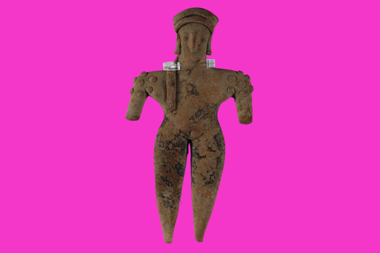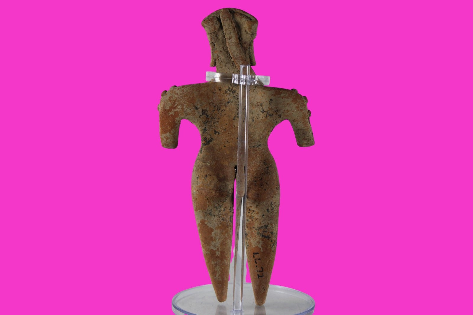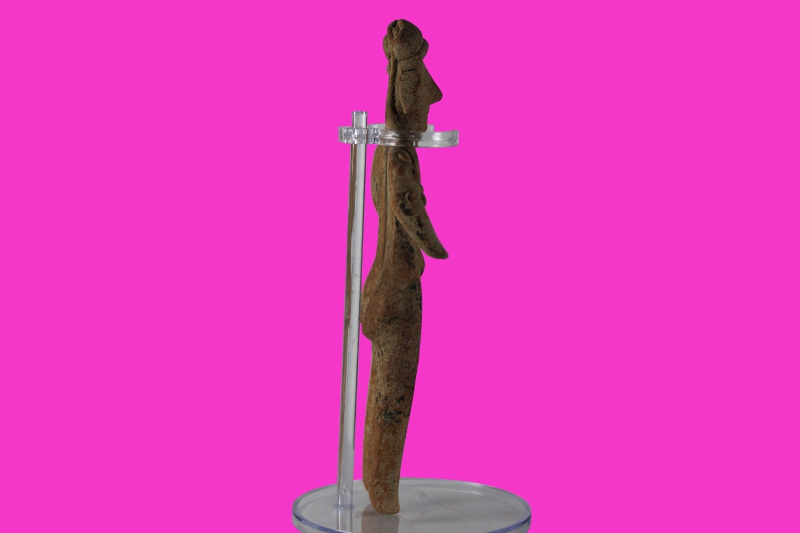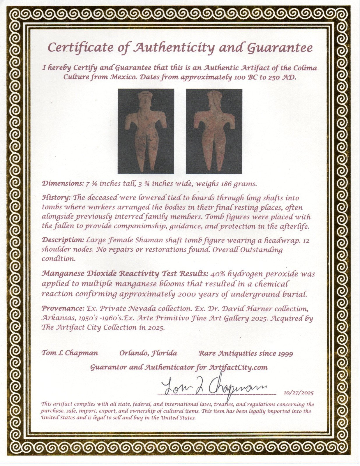 Dimensions: 7 ¼ inches tall, 3 ¾ inches wide, weighs 186 grams. History: The deceased were lowered tied to boards through long shafts into tombs where workers arranged the bodies in their final resting places, often alongside previously interred family members. Tomb figures were placed with the fallen to provide companionship, guidance, and protection in the afterlife. Description: Large Female Shaman shaft tomb figure wearing a headwrap. 12 shoulder nodes. No repairs or restorations found. Overall Outstanding condition. Manganese Dioxide Reactivity Test Results: 40% hydrogen peroxide was applied to multiple manganese blooms that resulted in a chemical reaction confirming approximately 2000 years of underground burial. Provenance: Ex. Private Nevada collection. Ex. Dr. David Harner collection, Arkansas, 1950’s -1960’s.Ex. Arte Primitivo Fine Art Gallery 2025. Acquired by The Artifact City Collection in 2025.