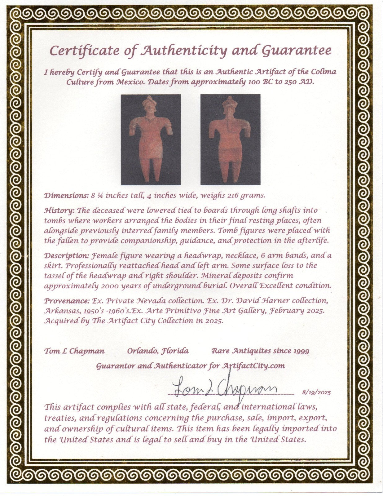 Dimensions: 8 ¼ inches tall, 4 inches wide, weighs 216 grams. History: The deceased were lowered tied to boards through long shafts into tombs where workers arranged the bodies in their final resting places, often alongside previously interred family members. Tomb figures were placed with the fallen to provide companionship, guidance, and protection in the afterlife. Description: Female figure wearing a headwrap, necklace, 6 arm bands, and a skirt. Professionally reattached head and left arm. Some surface loss to the tassel of the headwrap and right shoulder. Mineral deposits confirm approximately 2000 years of underground burial. Overall Excellent condition. Provenance: Ex. Private Nevada collection. Ex. Dr. David Harner collection, Arkansas, 1950’s -1960’s.Ex. Arte Primitivo Fine Art Gallery, February 2025. Acquired by The Artifact City Collection in 2025.