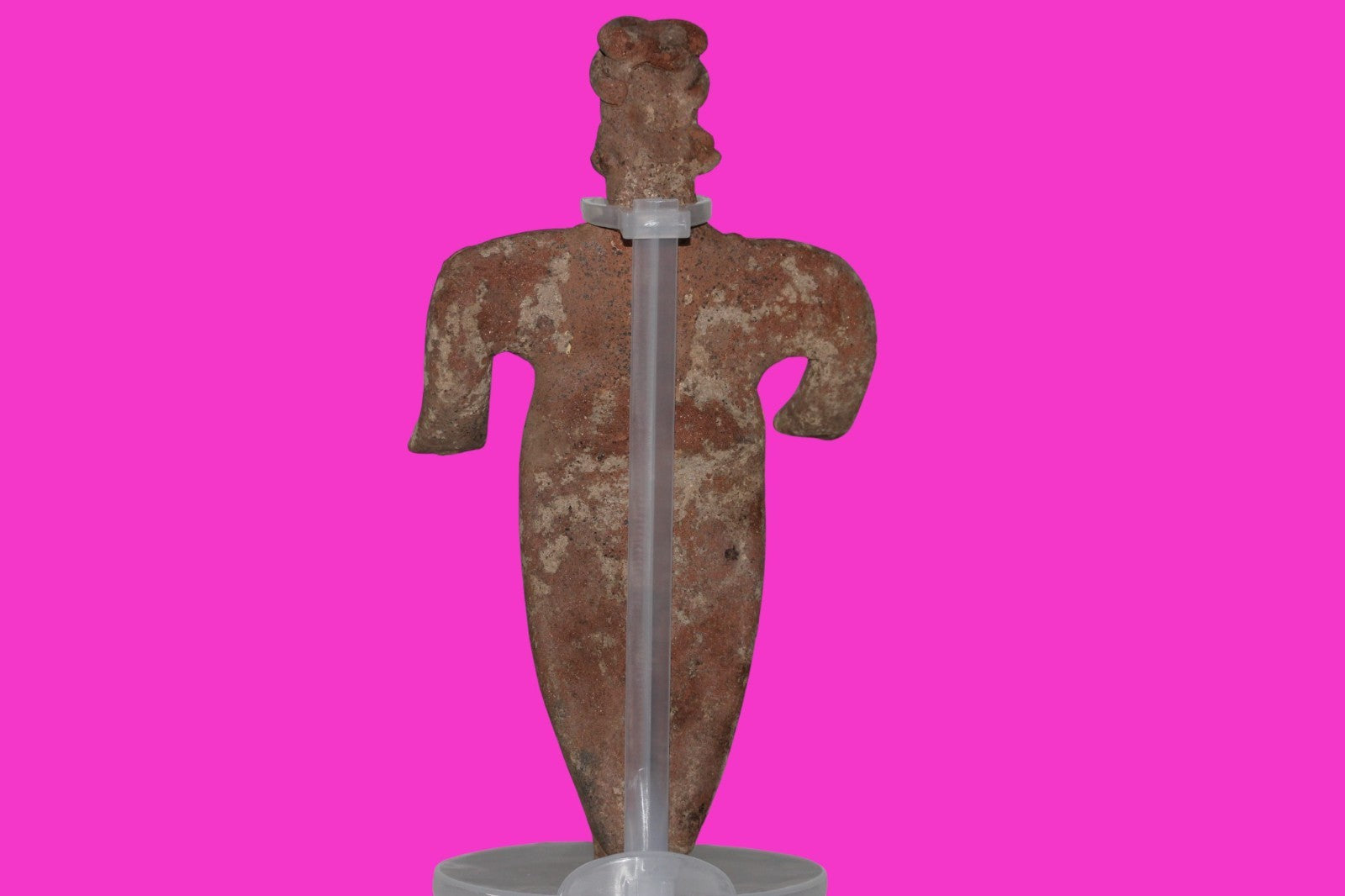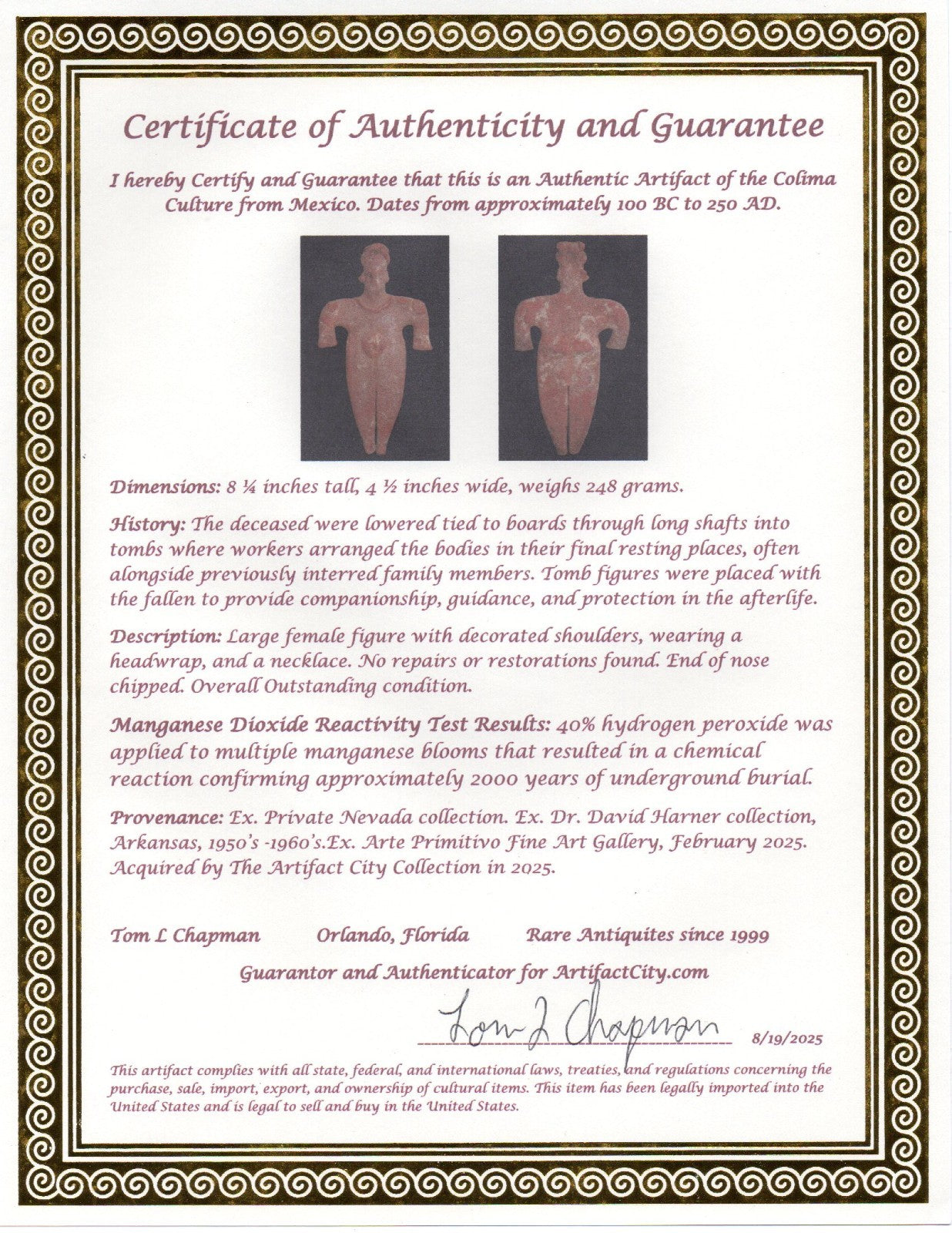 Dimensions: 8 ¼ inches tall, 4 ½ inches wide, weighs 248 grams. History: The deceased were lowered tied to boards through long shafts into tombs where workers arranged the bodies in their final resting places, often alongside previously interred family members. Tomb figures were placed with the fallen to provide companionship, guidance, and protection in the afterlife. Description: Large female figure with decorated shoulders, wearing a headwrap, and a necklace. No repairs or restorations found. End of nose chipped. Overall Outstanding condition. Manganese Dioxide Reactivity Test Results: 40% hydrogen peroxide was applied to multiple manganese blooms that resulted in a chemical reaction confirming approximately 2000 years of underground burial. Provenance: Ex. Private Nevada collection. Ex. Dr. David Harner collection, Arkansas, 1950’s -1960’s.Ex. Arte Primitivo Fine Art Gallery, February 2025. Acquired by The Artifact City Collection in 2025.