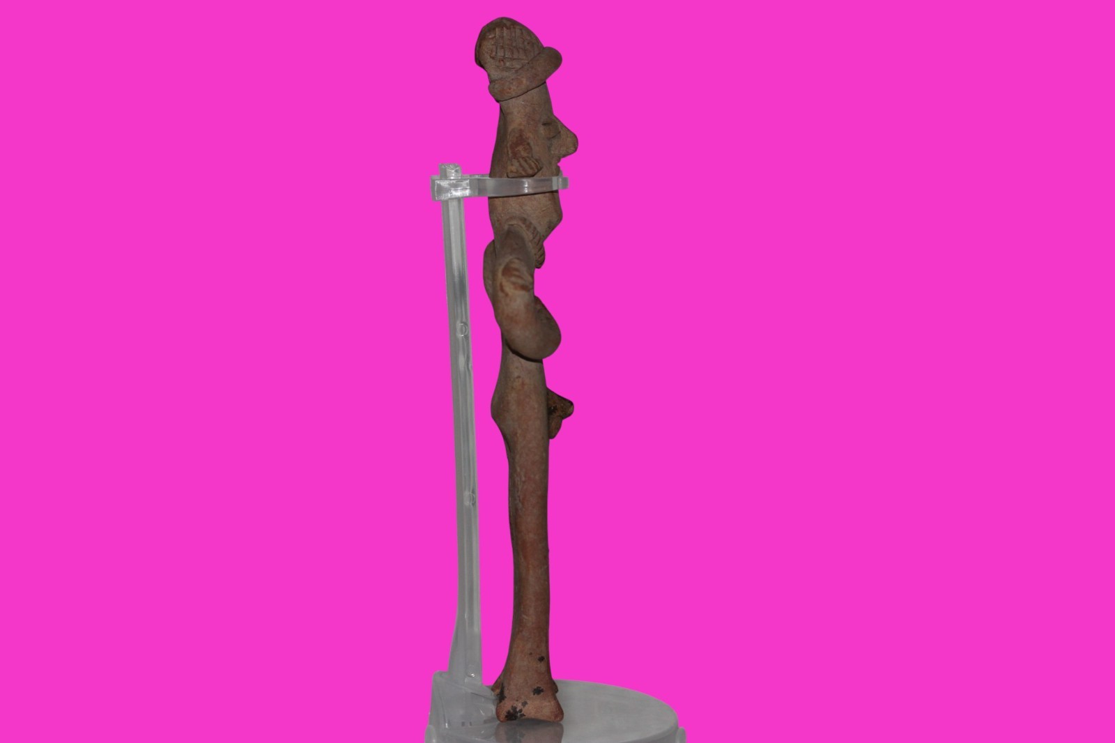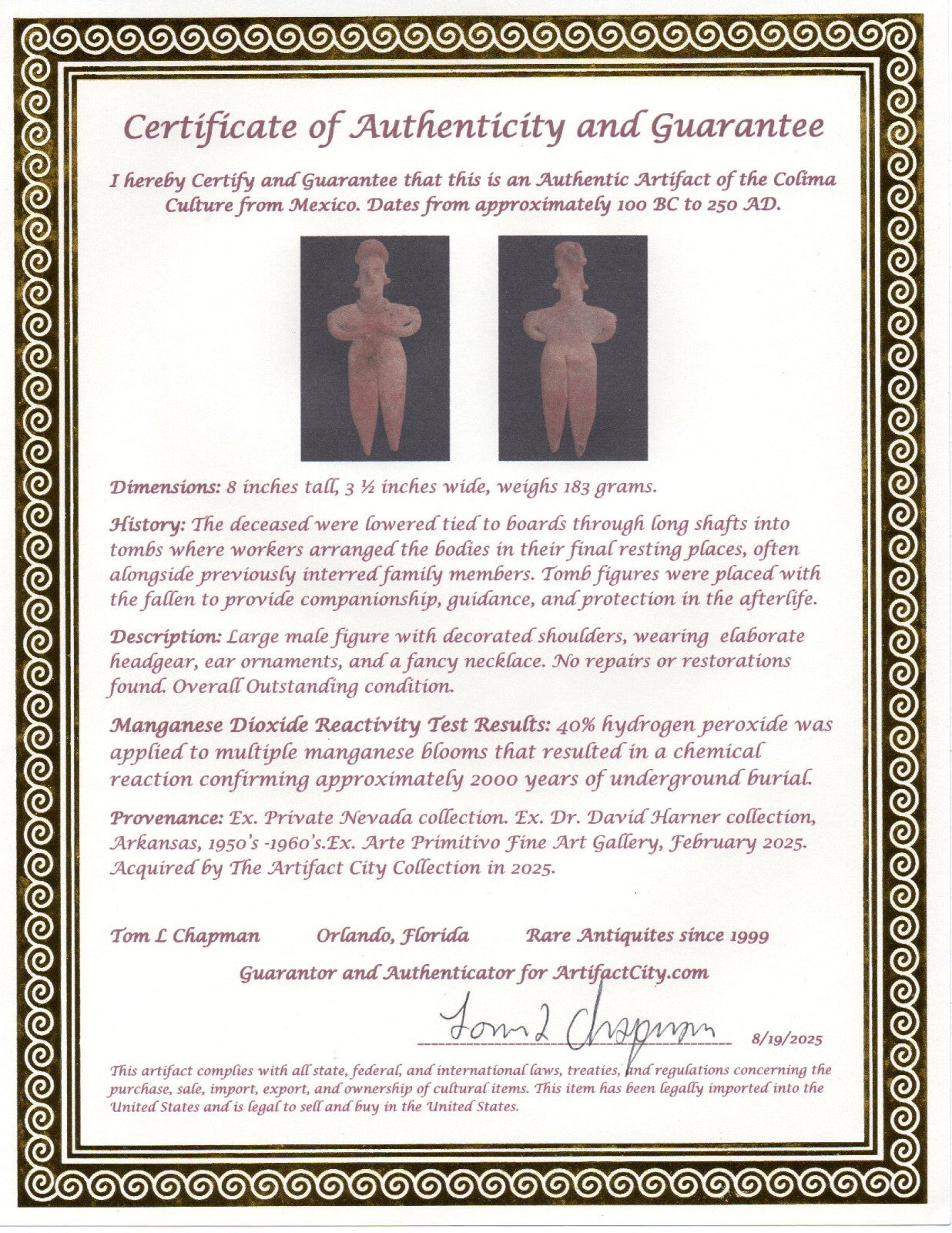 Dimensions: 8 inches tall, 3 ½ inches wide, weighs 183 grams. History: The deceased were lowered tied to boards through long shafts into tombs where workers arranged the bodies in their final resting places, often alongside previously interred family members. Tomb figures were placed with the fallen to provide companionship, guidance, and protection in the afterlife. Description: Large male figure with decorated shoulders, wearing elaborate headgear, ear ornaments, and a fancy necklace. No repairs or restorations found. Overall Outstanding condition. Manganese Dioxide Reactivity Test Results: 40% hydrogen peroxide was applied to multiple manganese blooms that resulted in a chemical reaction confirming approximately 2000 years of underground burial. Provenance: Ex. Private Nevada collection. Ex. Dr. David Harner collection, Arkansas, 1950’s -1960’s.Ex. Arte Primitivo Fine Art Gallery, February 2025. Acquired by The Artifact City Collection in 2025.