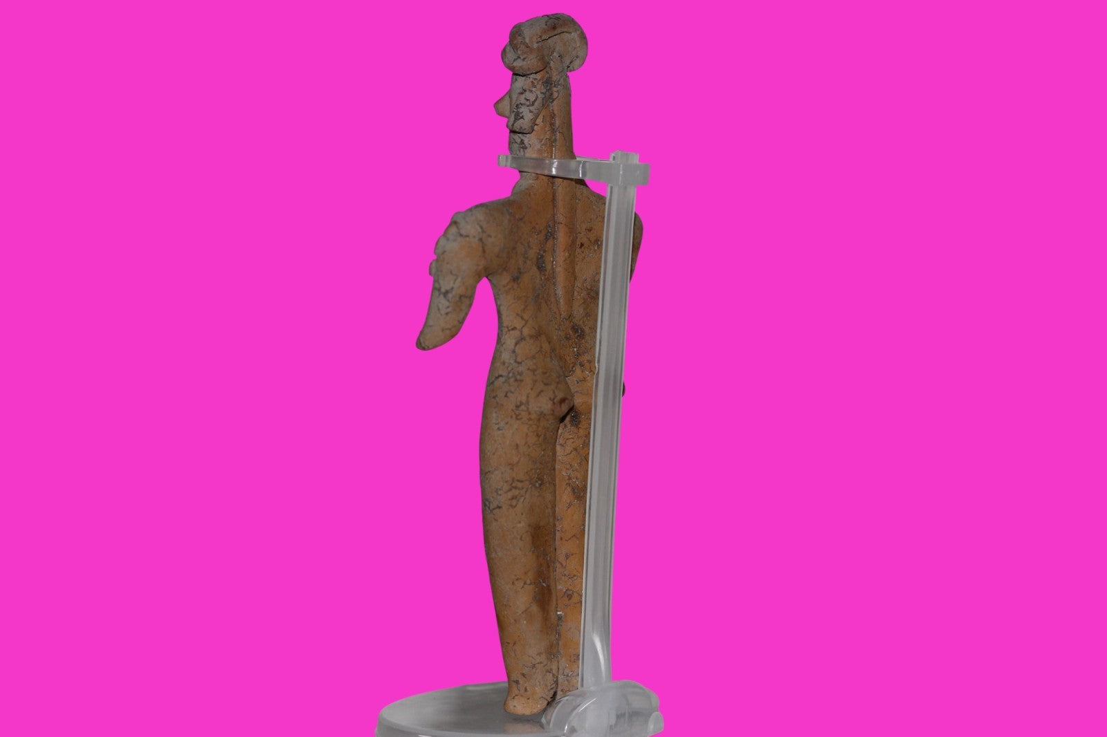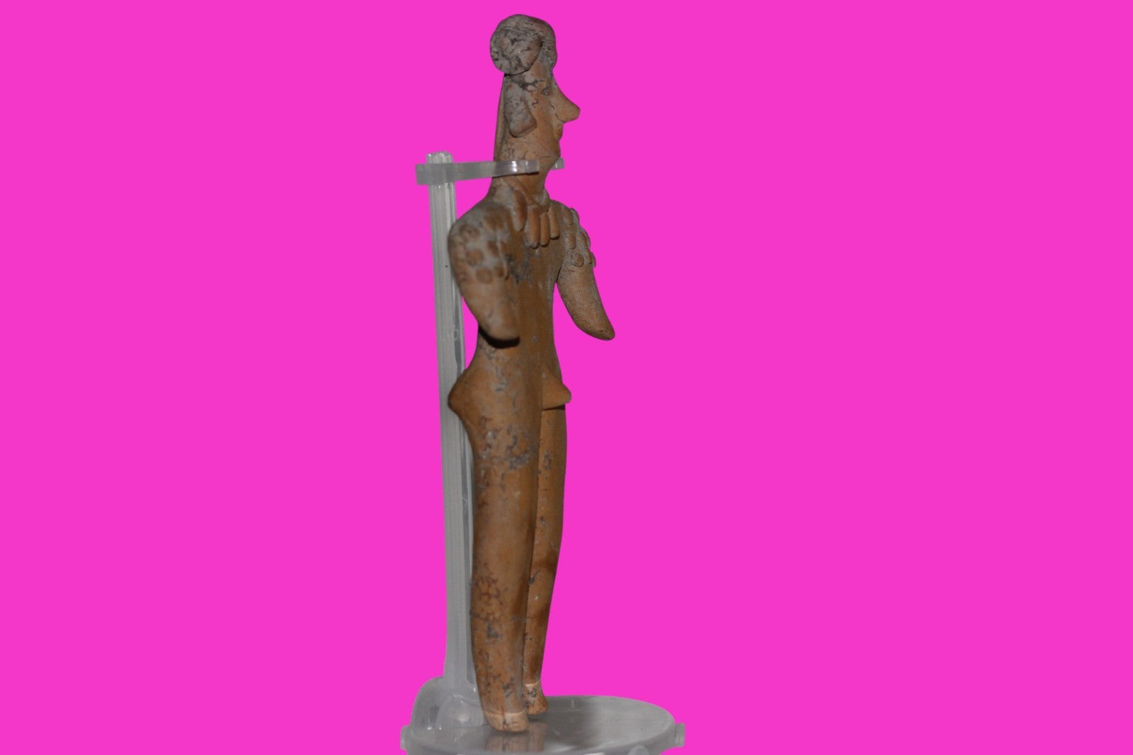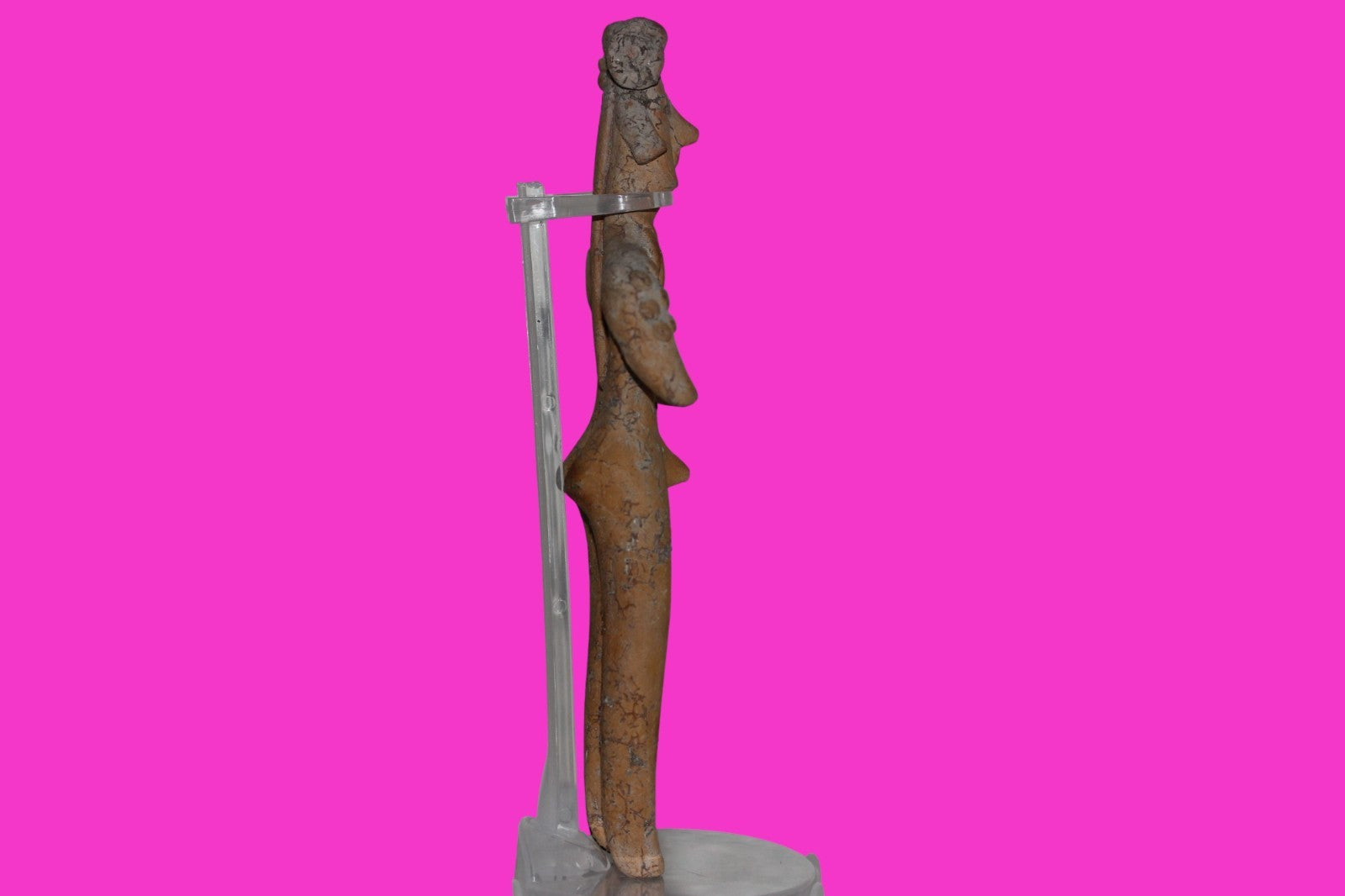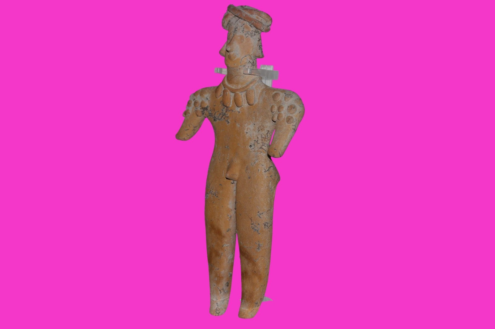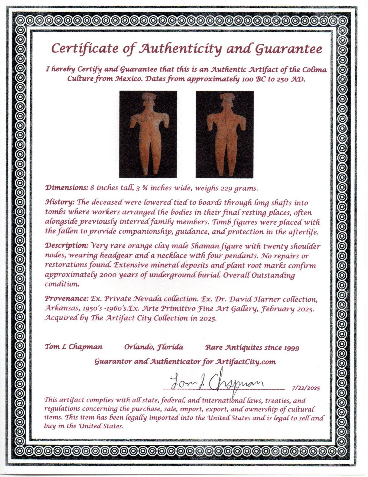 Dimensions: 8 inches tall, 3 ¾ inches wide, weighs 229 grams. History: The deceased were lowered tied to boards through long shafts into tombs where workers arranged the bodies in their final resting places, often alongside previously interred family members. Tomb figures were placed with the fallen to provide companionship, guidance, and protection in the afterlife. Description: Very rare orange clay male Shaman figure with twenty shoulder nodes, wearing headgear and a necklace with four pendants. No repairs or restorations found. Extensive mineral deposits and plant root marks confirm approximately 2000 years of underground burial. Overall Outstanding condition. Provenance: Ex. Private Nevada collection. Ex. Dr. David Harner collection, Arkansas, 1950’s -1960’s.Ex. Arte Primitivo Fine Art Gallery, February 2025. Acquired by The Artifact City Collection in 2025.