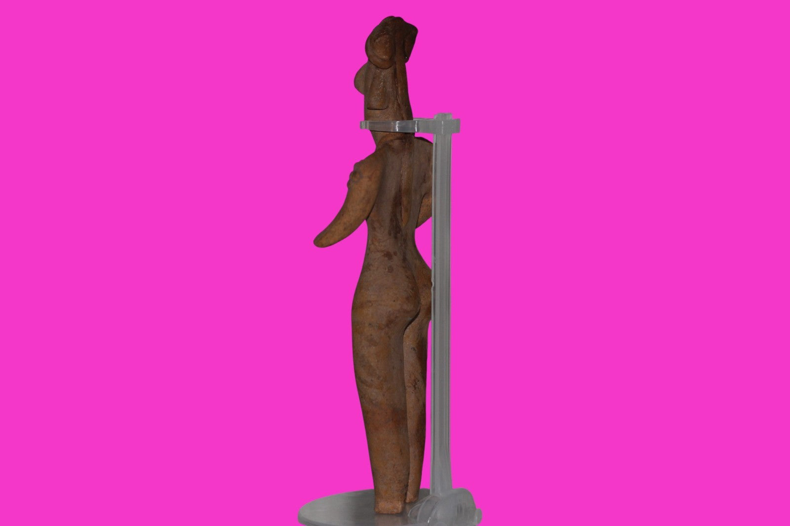 Dimensions: 8 ½ inches tall, 4 inches wide, weighs 307 grams.History: The deceased were lowered tied to boards through long shafts into tombs where workers arranged the bodies in their final resting places, often alongside previously interred family members. Tomb figures were placed with the fallen to provide companionship, guidance, and protection in the afterlife. Description: Tall female Shaman figure wearing headgear with 14 shoulder nodes. Professionally repaired and restored. Overall Outstanding condition. Manganese Dioxide Reactivity Test Results: 40% hydrogen peroxide was applied to multiple manganese blooms that resulted in a chemical reaction confirming approximately 2000 years of underground burial. Provenance: Ex. Private Nevada collection. Ex. Dr. David Harner collection, Arkansas, 1950’s -1960’s.Ex. Arte Primitivo Fine Art Gallery, February 2025. Acquired by The Artifact City Collection in 2025.