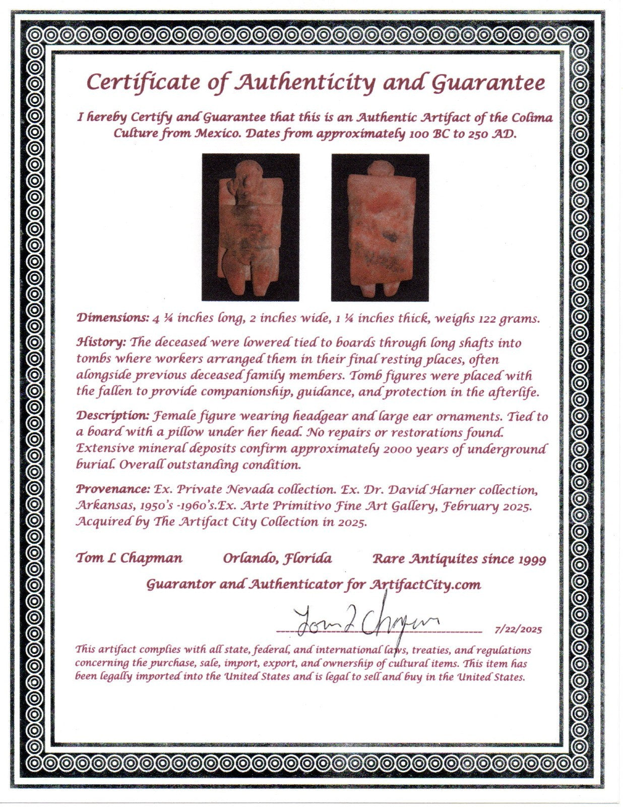 Dimensions: 4 ¼ inches long, 2 inches wide, 1 ¼ inches thick, weighs 122 grams. History: The deceased were lowered tied to boards through long shafts into tombs where workers arranged them in their final resting places, often alongside previous deceased family members. Tomb figures were placed with the fallen to provide companionship, guidance, and protection in the afterlife. Description: Female figure wearing headgear and large ear ornaments. Tied to a board with a pillow under her head. No repairs or restorations found. Extensive mineral deposits confirm approximately 2000 years of underground burial. Overall outstanding condition. Provenance: Ex. Private Nevada collection. Ex. Dr. David Harner collection, Arkansas, 1950’s -1960’s.Ex. Arte Primitivo Fine Art Gallery, February 2025. Acquired by The Artifact City Collection in 2025.