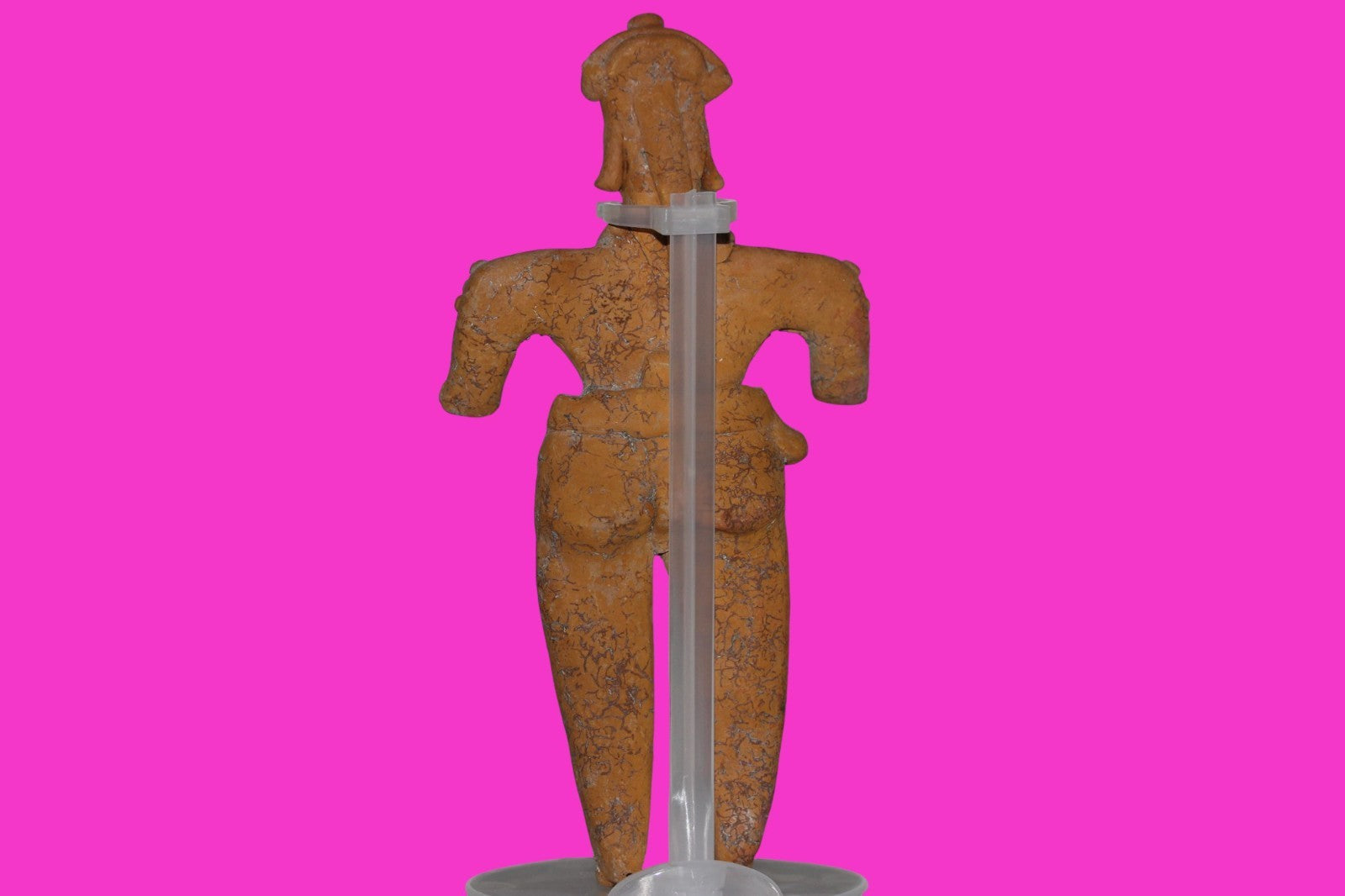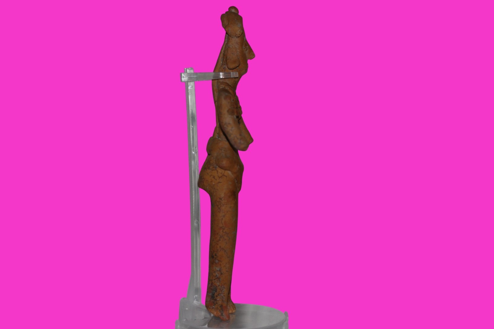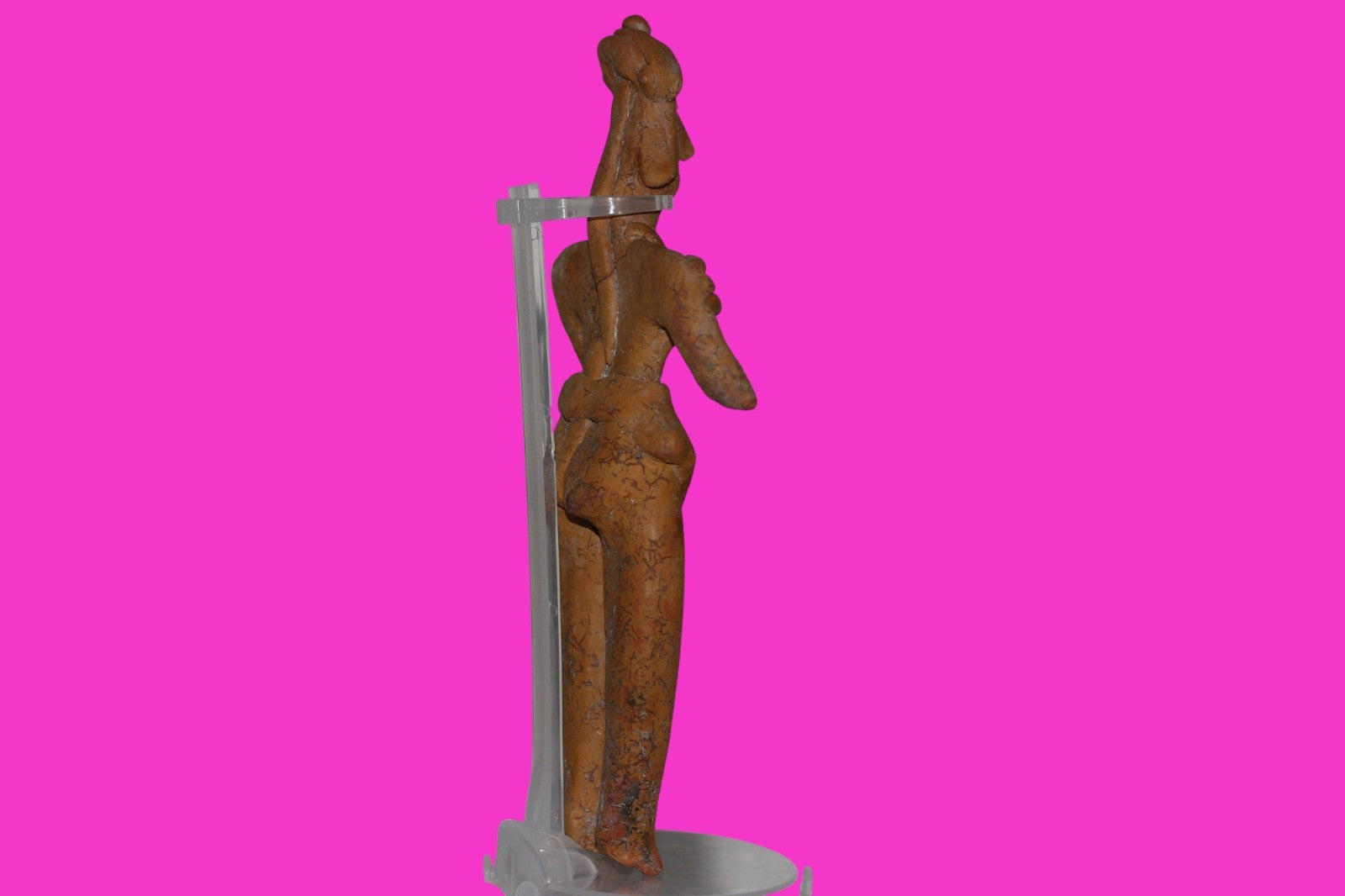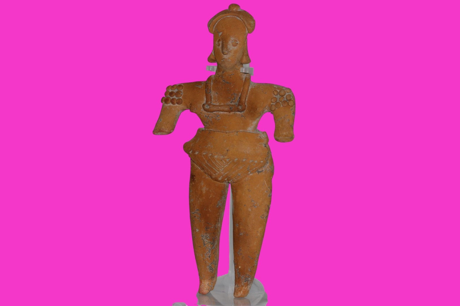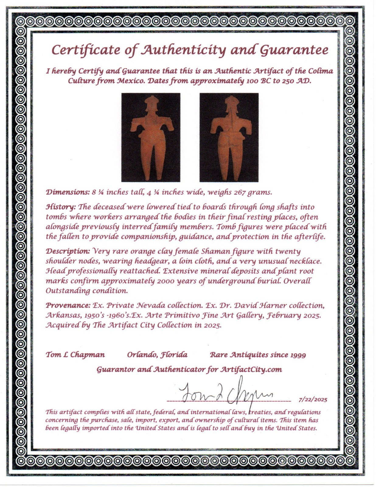 Dimensions: 8 ¼ inches tall, 4 ¼ inches wide, weighs 267 grams. History: The deceased were lowered tied to boards through long shafts into tombs where workers arranged the bodies in their final resting places, often alongside previously interred family members. Tomb figures were placed with the fallen to provide companionship, guidance, and protection in the afterlife. Description: Very rare orange clay female Shaman figure with twenty shoulder nodes, wearing headgear, a loin cloth, and a very unusual necklace. Head professionally reattached. Extensive mineral deposits and plant root marks confirm approximately 2000 years of underground burial. Overall Outstanding condition. Provenance: Ex. Private Nevada collection. Ex. Dr. David Harner collection, Arkansas, 1950’s -1960’s.Ex. Arte Primitivo Fine Art Gallery, February 2025. Acquired by The Artifact City Collection in 2025.