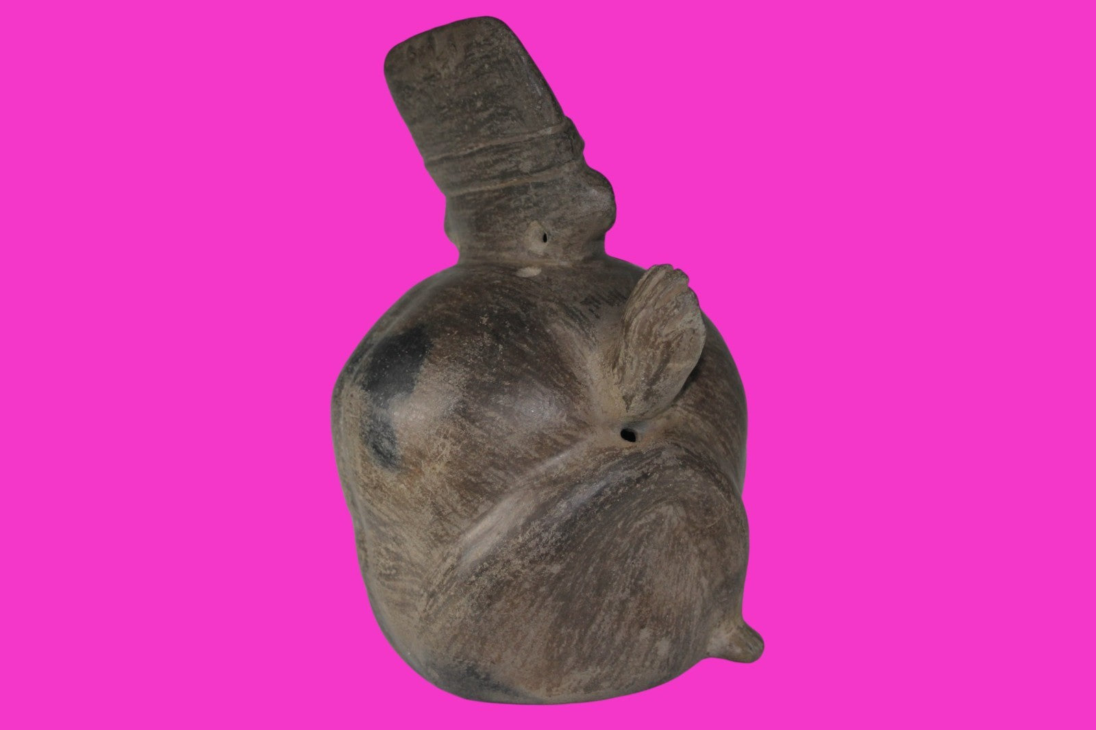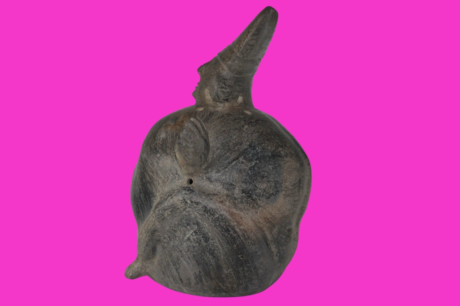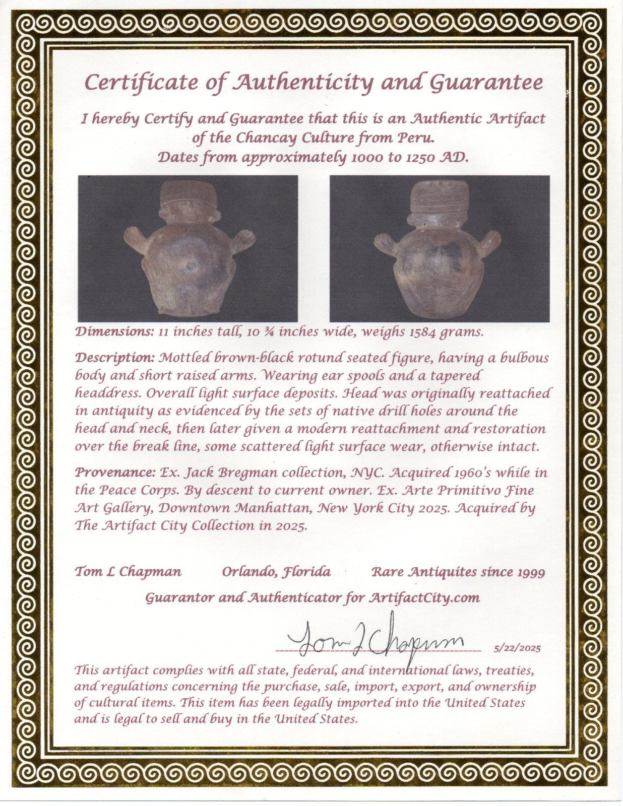 Dimensions: 11 inches tall, 10 ¾ inches wide, weighs 1584 grams. Description: Mottled brown-black rotund seated figure, having a bulbous body and short raised arms. Wearing ear spools and a tapered headdress. Overall light surface deposits. Head was originally reattached in antiquity as evidenced by the sets of native drill holes around the head and neck, then later given a modern reattachment and restoration over the break line, some scattered light surface wear, otherwise intact. Provenance: Ex. Jack Bregman collection, NYC. Acquired 1960’s while in the Peace Corps. By descent to current owner. Ex. Arte Primitivo Fine Art Gallery, Downtown Manhattan, New York City 2025. Acquired by The Artifact City Collection in 2025.
