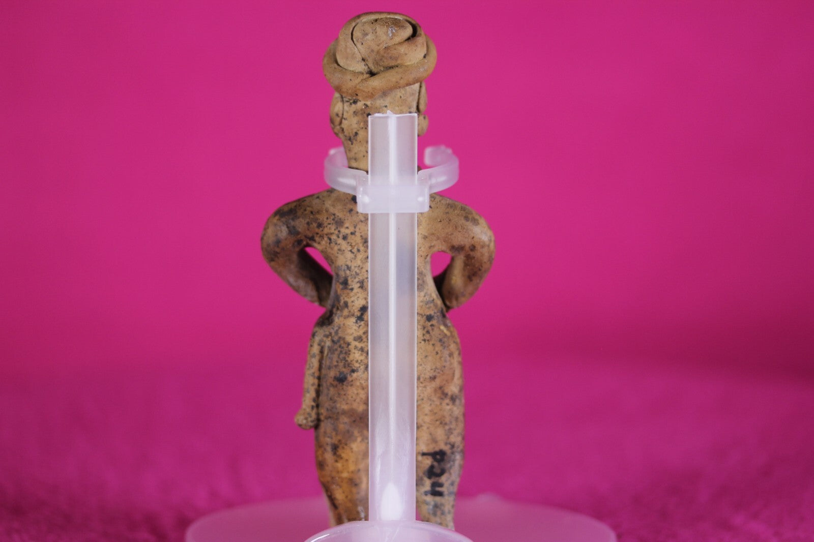 Outstanding condition. Very rare in this condition. The Colima culture buried their fallen with figurines like this stunning example so the deceased would have companionship in the afterlife. A shaft was dug straight down and a tomb dug out at the bottom of the shaft. The deceased was then placed in the tomb with a burial buddy and other pottery items than they might need in their afterlife.
