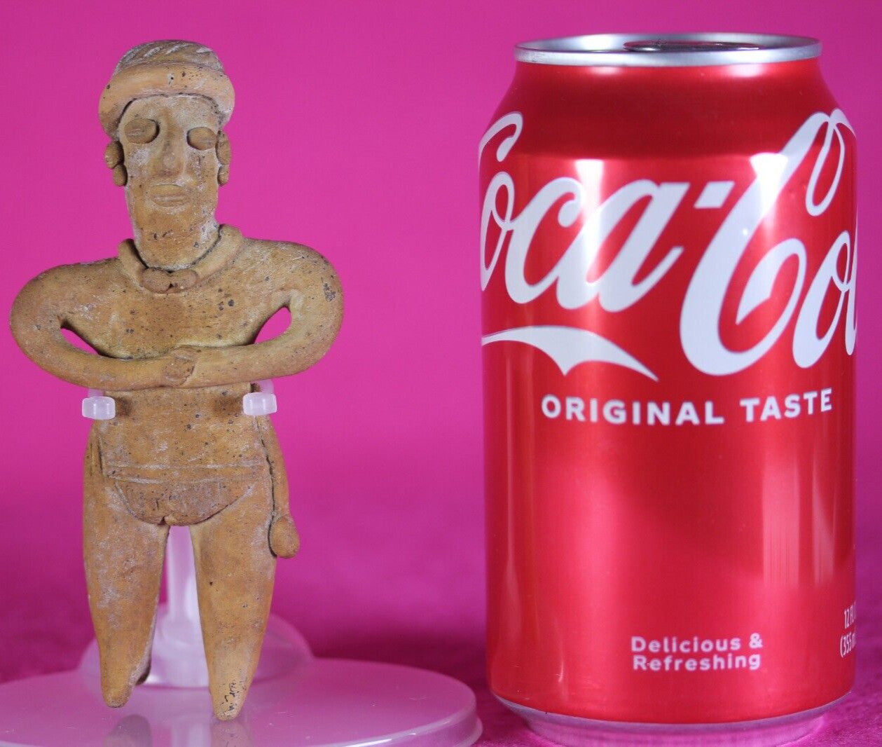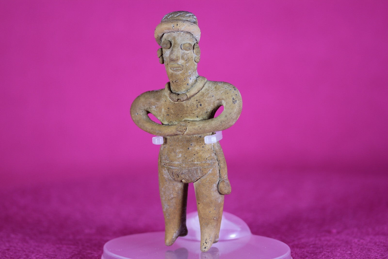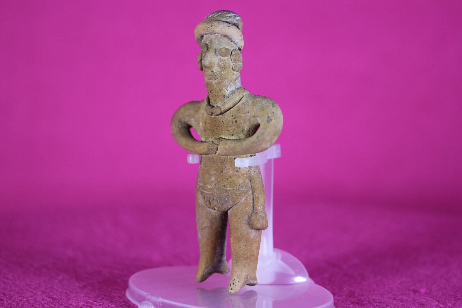 Outstanding condition. Restored Very rare in this condition. The Colima culture buried their fallen with figurines like this stunning example so the deceased would have companionship in the afterlife. A shaft was dug straight down and a tomb dug out at the bottom of the shaft. The deceased was then placed in the tomb with a burial buddy and other pottery items than they might need in their afterlife.
