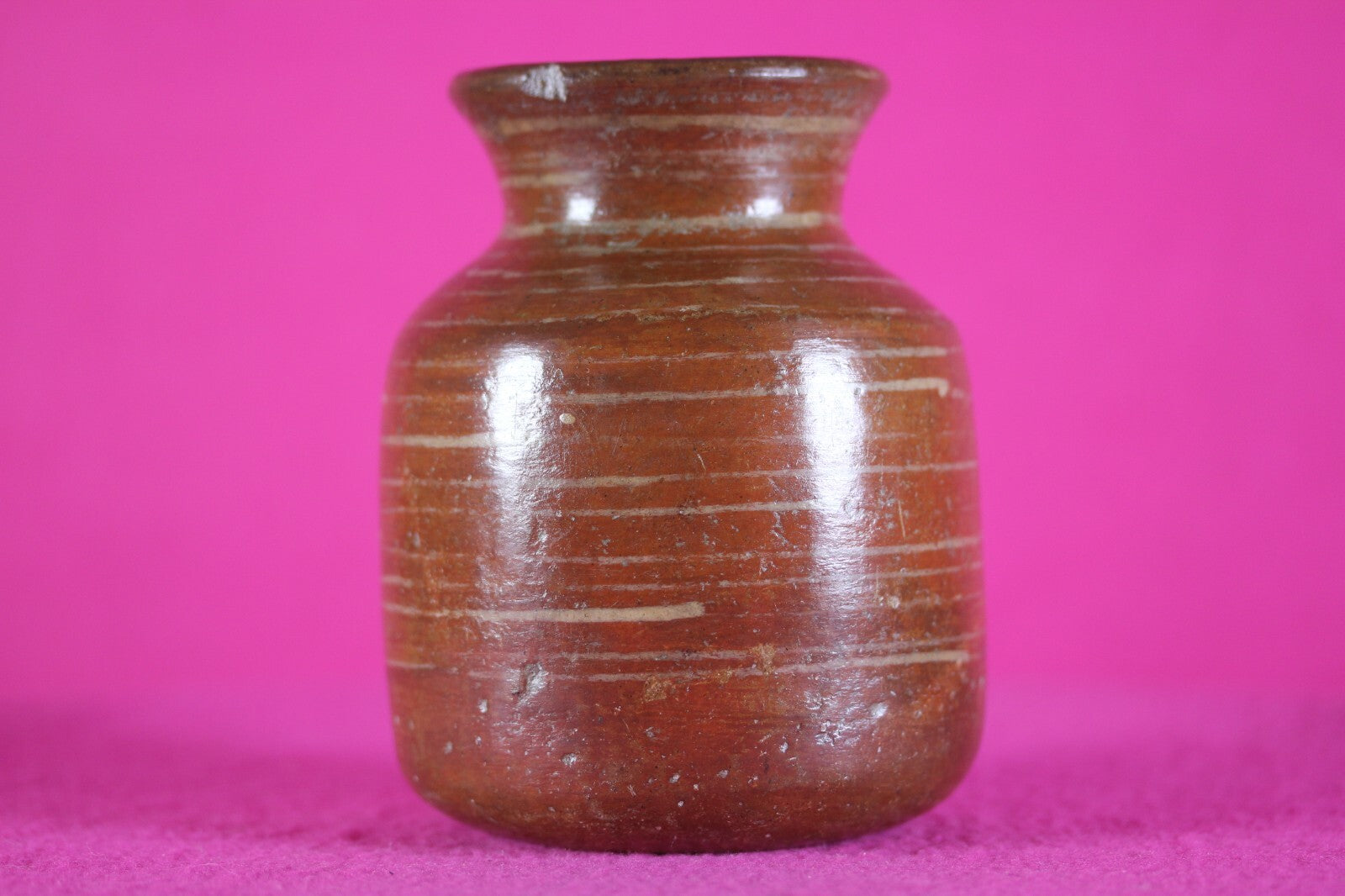 This beautiful orange olla features horizontal tan, yellow, and brown lines. Incredible sheen. This is a perfect example of the high quality pottery the Michoacan civilization created 2000 years ago. Very sturdy. No repairs found. One small rim chip.