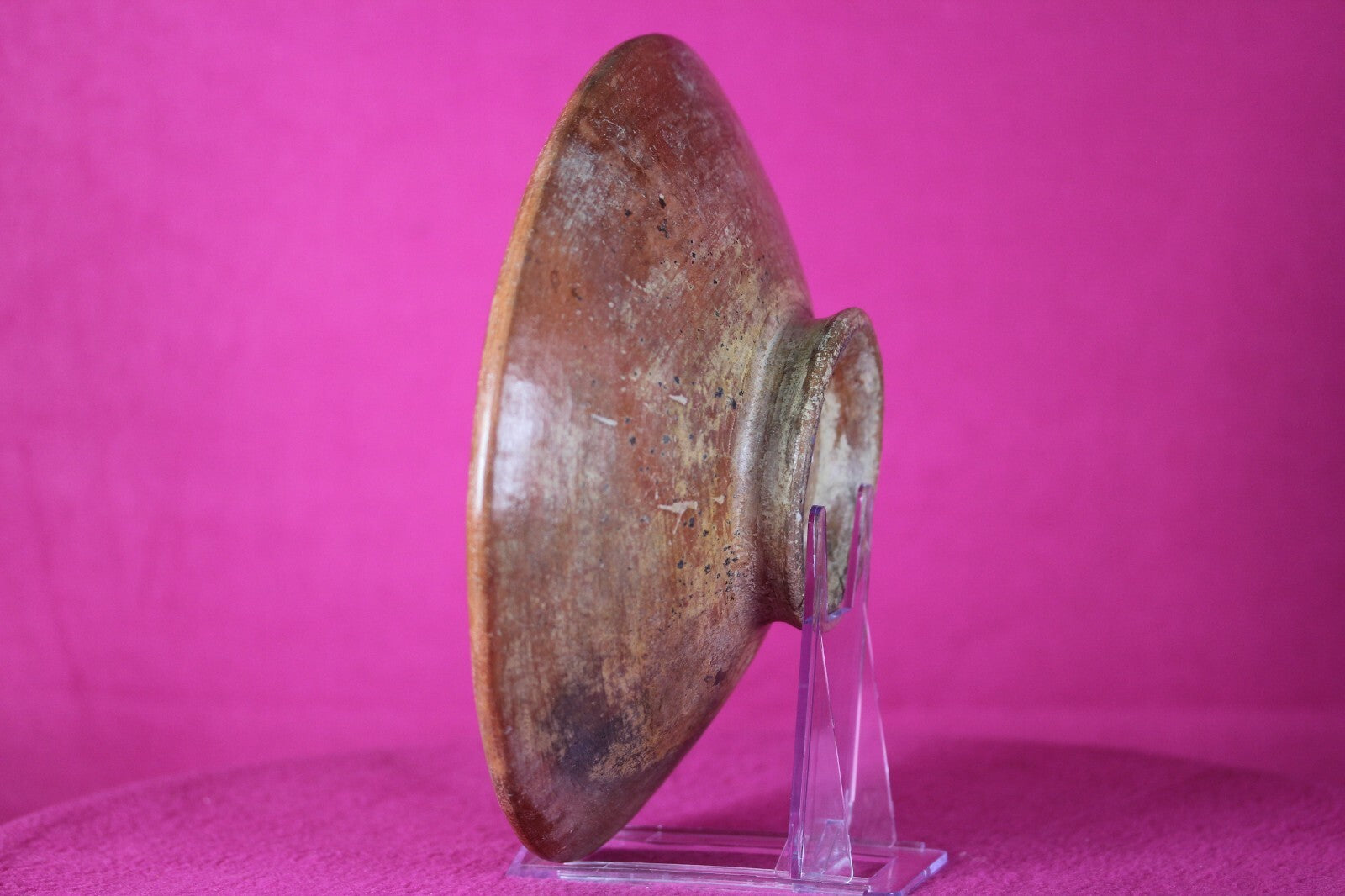 Panamanian orange plain ware low pedestal dish, undecorated. Repaired from two large original pieces.