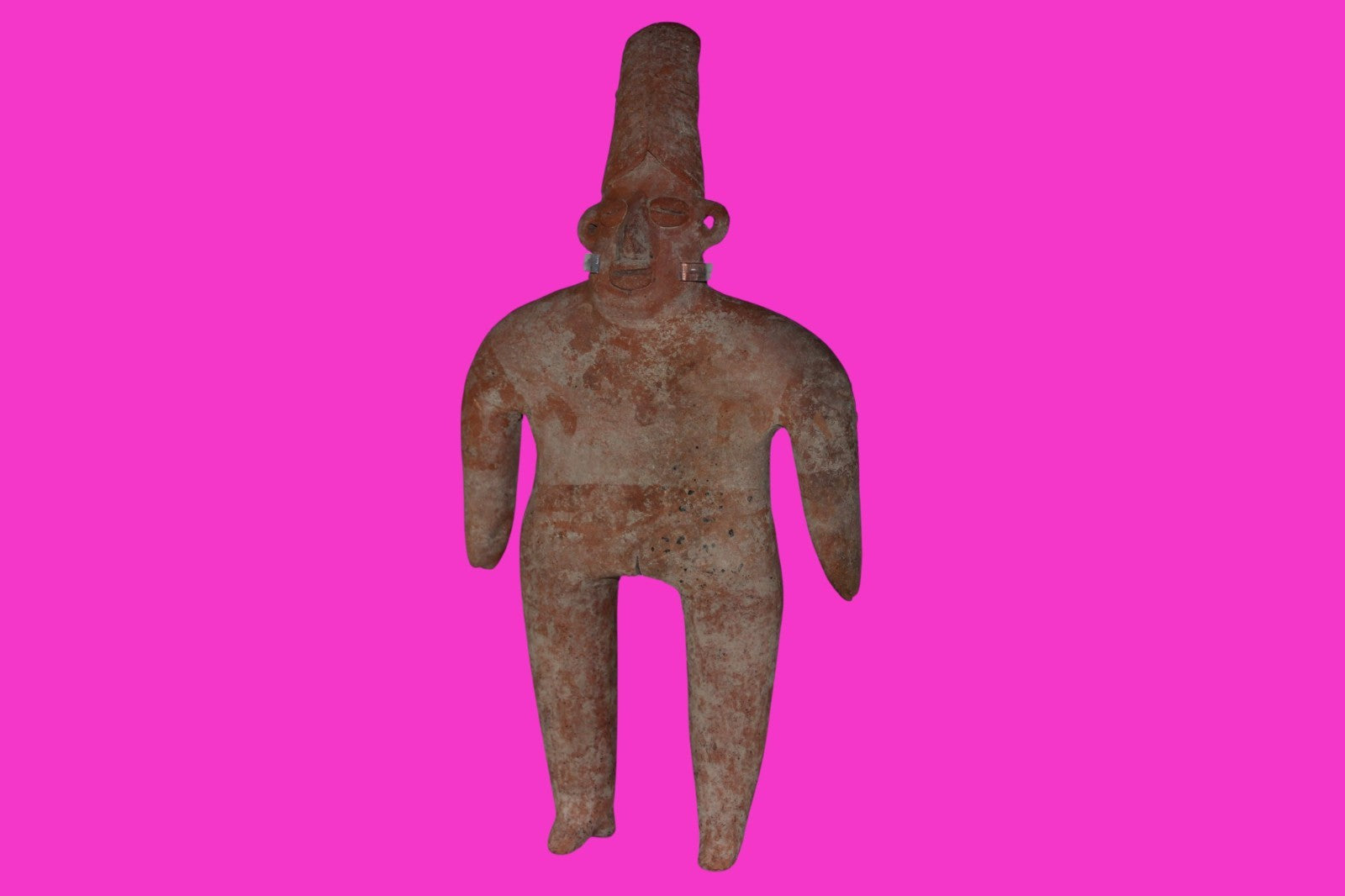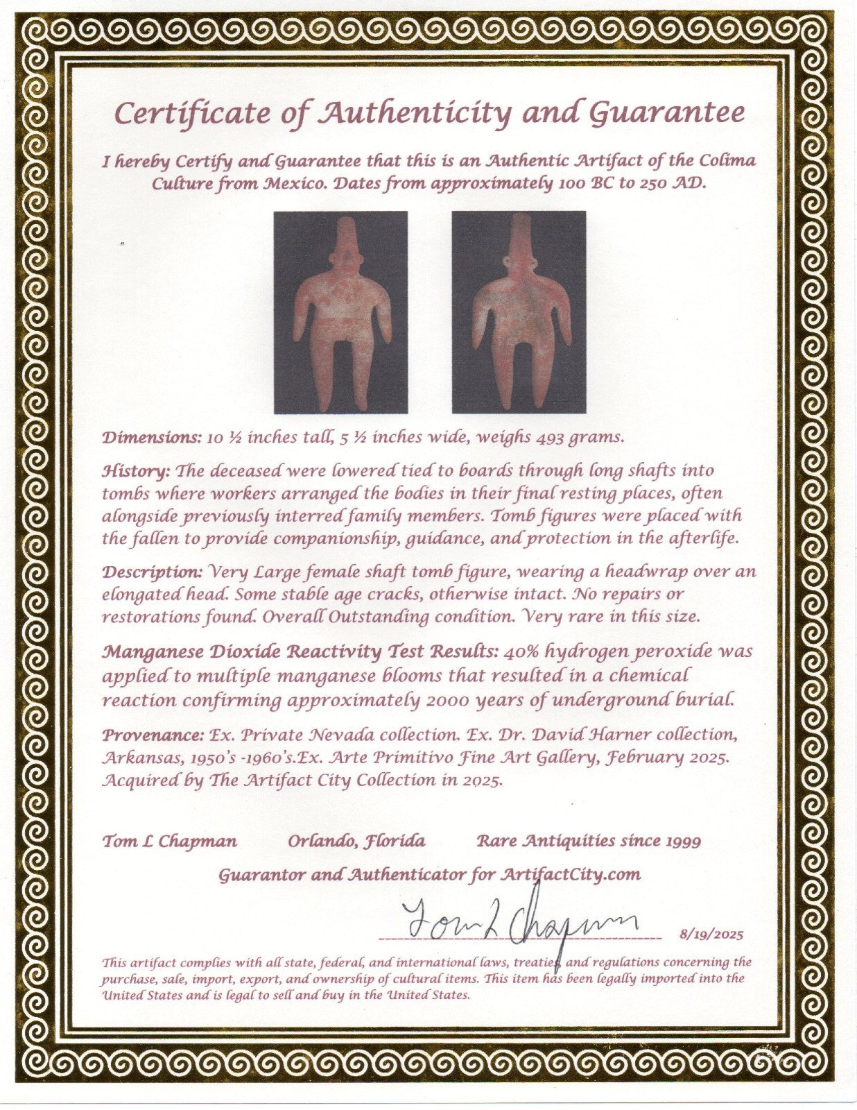 Dimensions: 10 ½ inches tall, 5 ½ inches wide, weighs 493 grams.History: The deceased were lowered tied to boards through long shafts into tombs where workers arranged the bodies in their final resting places, often alongside previously interred family members. Tomb figures were placed with the fallen to provide companionship, guidance, and protection in the afterlife.Description: Very Large female shaft tomb figure, wearing a headwrap over an elongated head. Some stable age cracks, otherwise intact. No repairs or restorations found. Overall Outstanding condition. Very rare in this size.Manganese Dioxide Reactivity Test Results: 40% hydrogen peroxide was applied to multiple manganese blooms that resulted in a chemical reaction confirming approximately 2000 years of underground burial.Provenance: Ex. Private Nevada collection. Ex. Dr. David Harner collection, Arkansas, 1950’s -1960’s.Ex. Arte Primitivo Fine Art Gallery, February 2025. Acquired by The Artifact City Collection in 2025