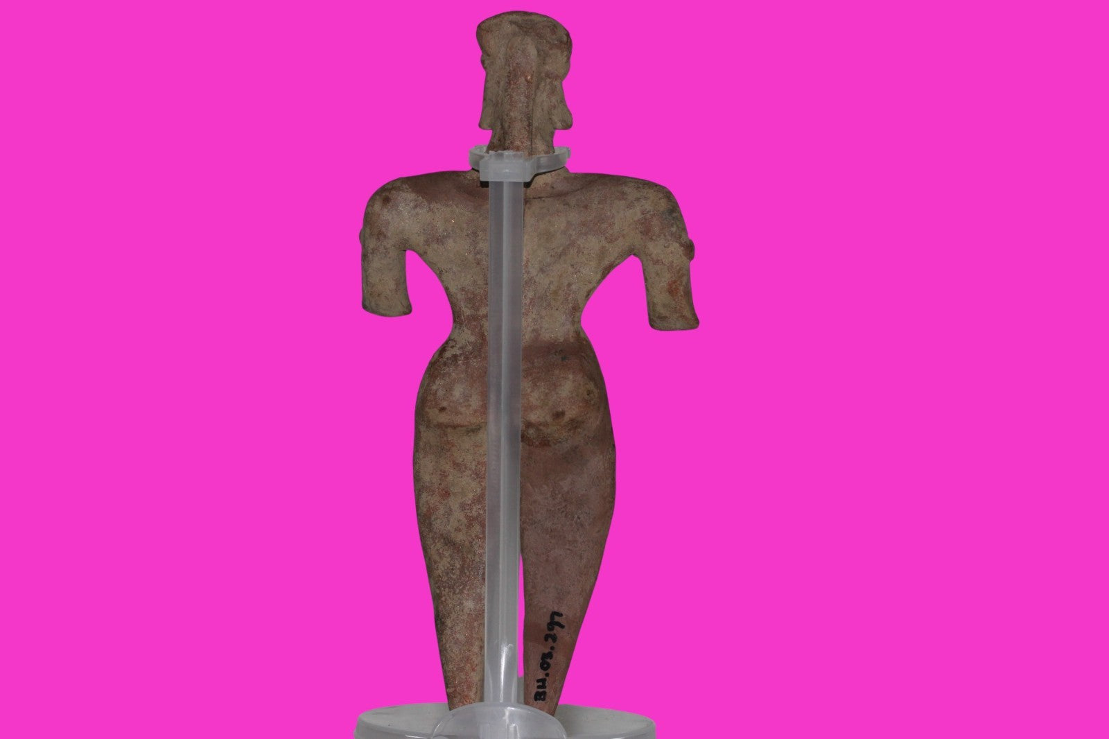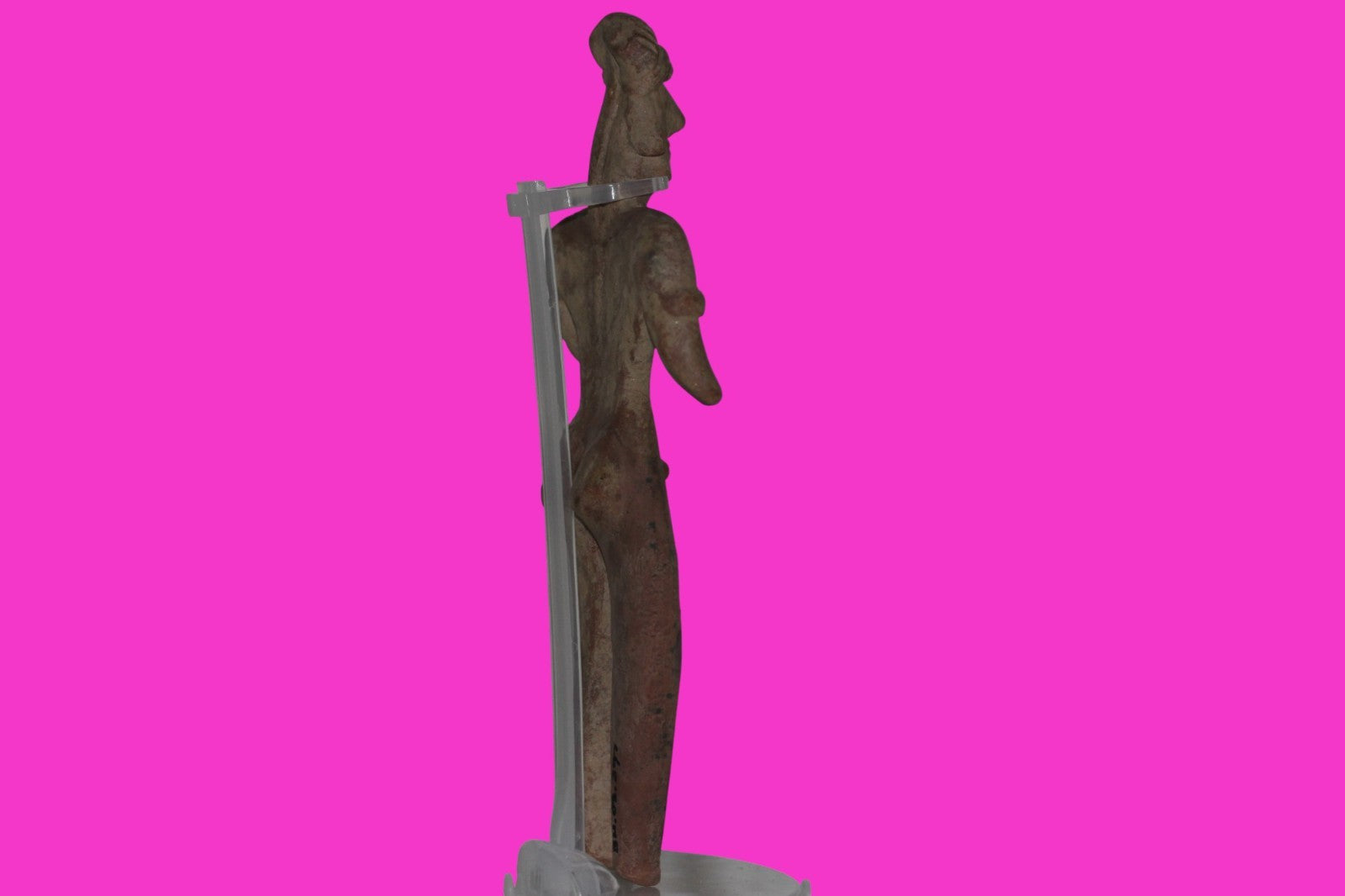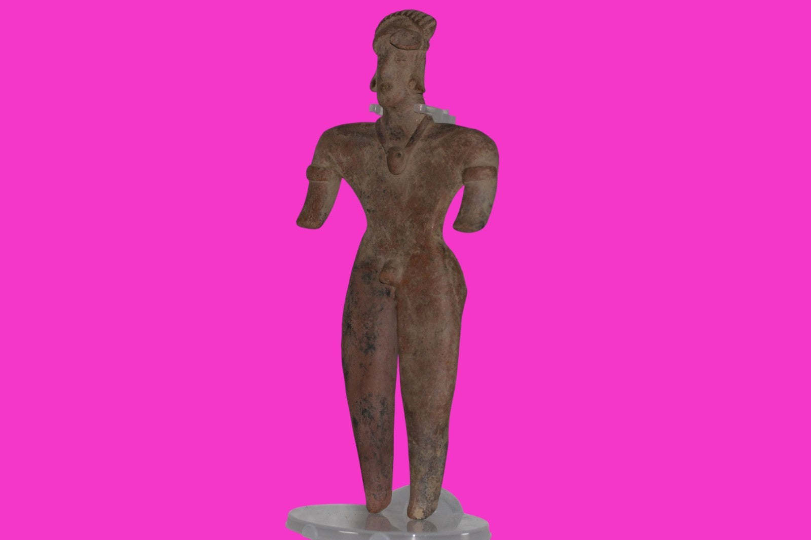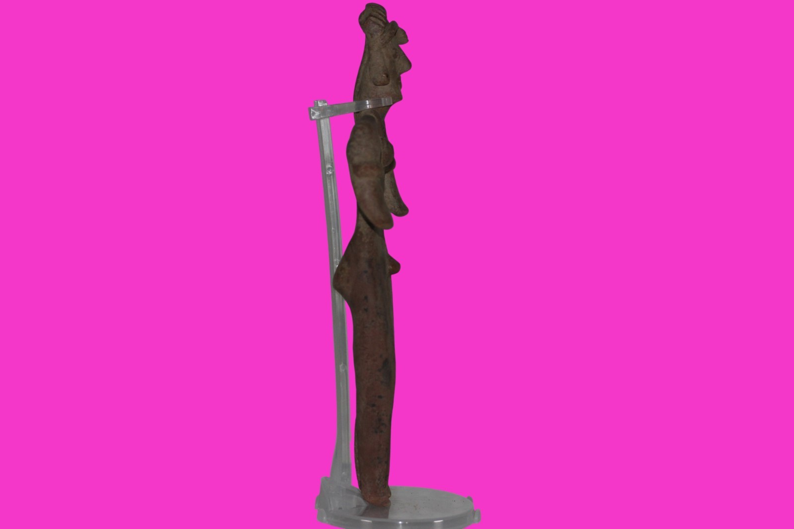Dimensions: 9 inches tall, 4 ½ inches wide, weighs 315 grams. History: The deceased were lowered tied to boards through long shafts into tombs where workers arranged them in their final resting places, often alongside previous deceased family members. Tomb figures were placed with the fallen to provide companionship, guidance, and protection in the afterlife. Description: Very tall male figure wearing headgear, a decorated headband, two armbands, and a fancy necklace. Right leg and top of torso professionally reattached and restored. Mineral deposits confirm approximately 2000 years of underground burial. Overall excellent condition. Provenance: Ex. Private Nevada collection. Ex. Dr. David Harner collection, Arkansas, 1950’s -1960’s.Ex. Arte Primitivo Fine Art Gallery 2025. Acquired by The Artifact City Collection in 2025.