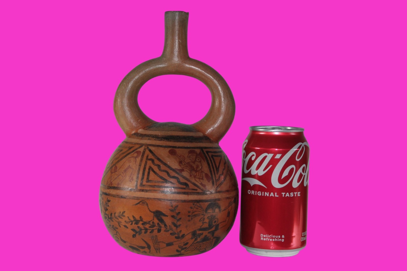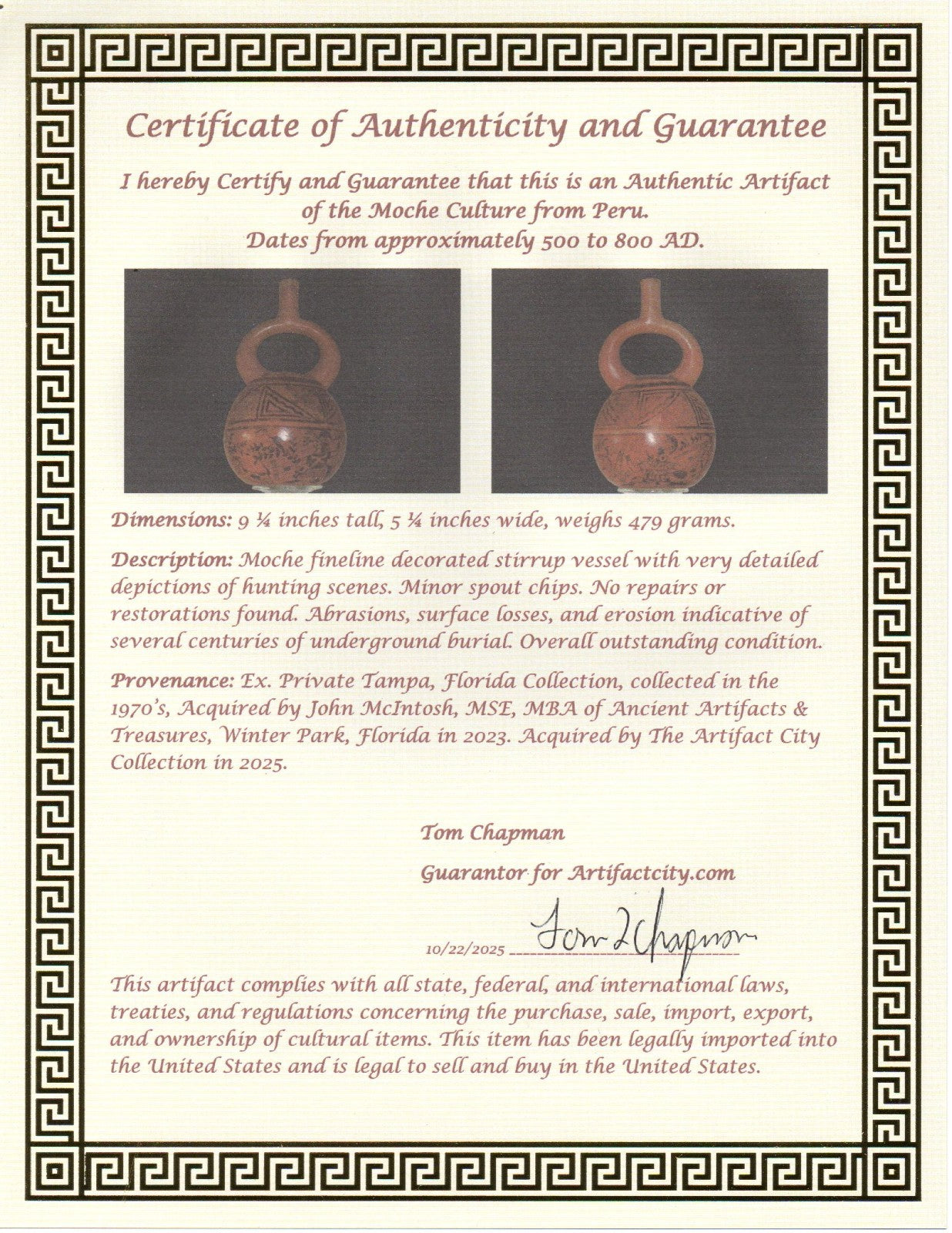 Dimensions: 9 ¼ inches tall, 5 ¼ inches wide, weighs 479 grams. Description: Moche fineline decorated stirrup vessel with very detailed depictions of hunting scenes. Minor spout chips. No repairs or restorations found. Abrasions, surface losses, and erosion indicative of several centuries of underground burial. Overall outstanding condition. Provenance: Ex. Private Tampa, Florida Collection, collected in the 1970’s, Acquired by John McIntosh, MSE, MBA of Ancient Artifacts & Treasures, Winter Park, Florida in 2023. Acquired by The Artifact City Collection in 2025.