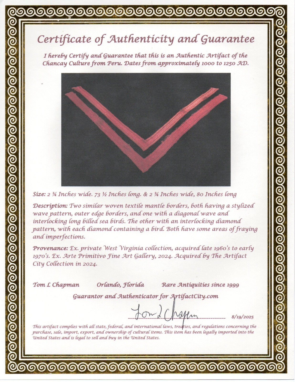 Size: 2 ¾ Inches wide. 73 ½ Inches long. & 2 ¾ Inches wide, 80 Inches long Description: Two similar woven textile mantle borders, both having a stylized wave pattern, outer edge borders, and one with a diagonal wave and interlocking long billed sea birds. The other with an interlocking diamond pattern, with each diamond containing a bird. Both have some areas of fraying and imperfections. Provenance: Ex. private West Virginia collection, acquired late 1960’s to early 1970’s. Ex. Arte Primitivo Fine Art Gallery, 2024. Acquired by The Artifact City Collection in 2024.