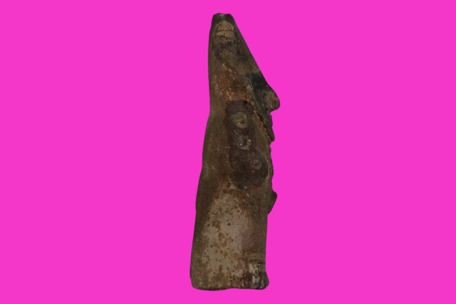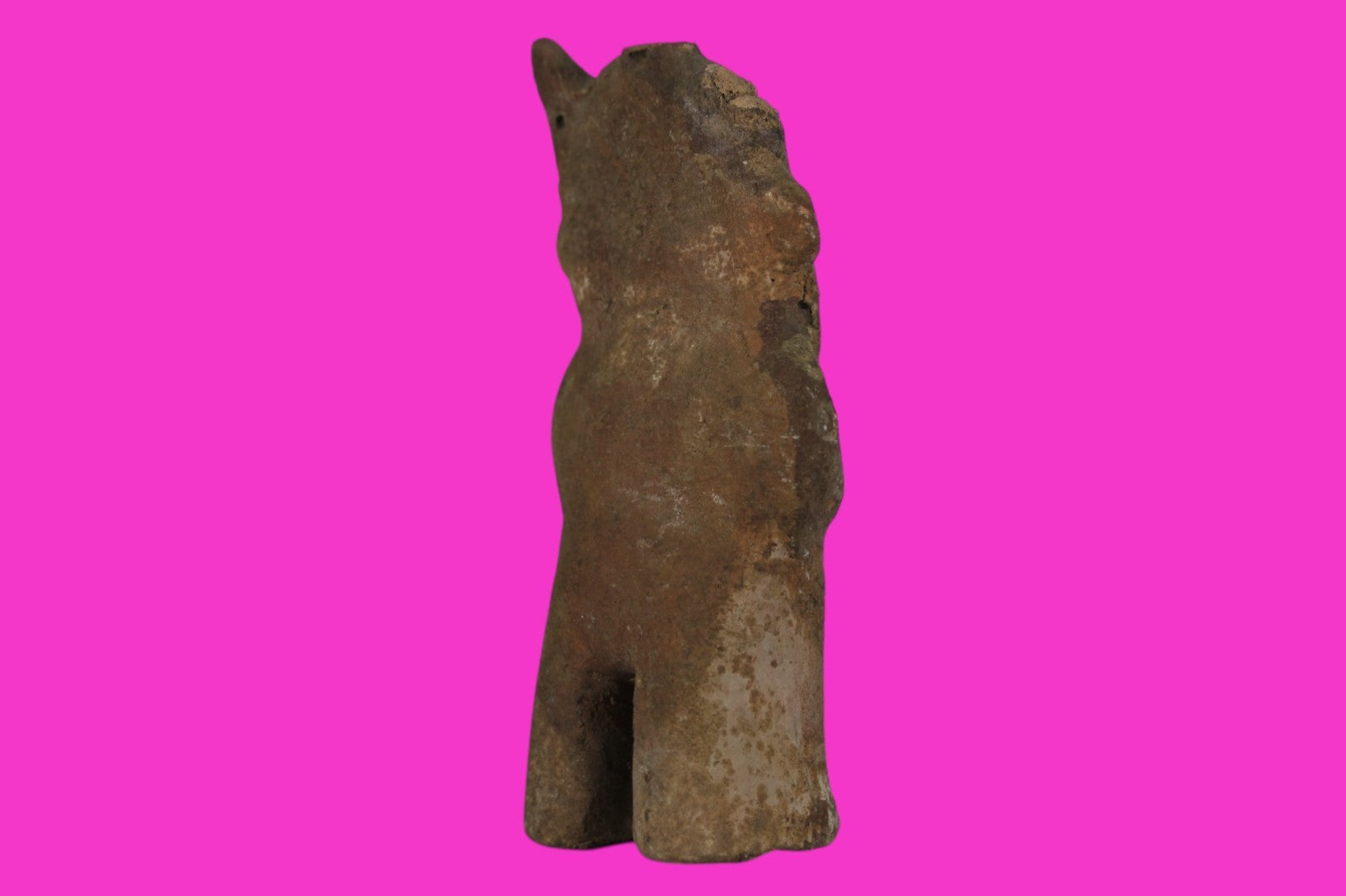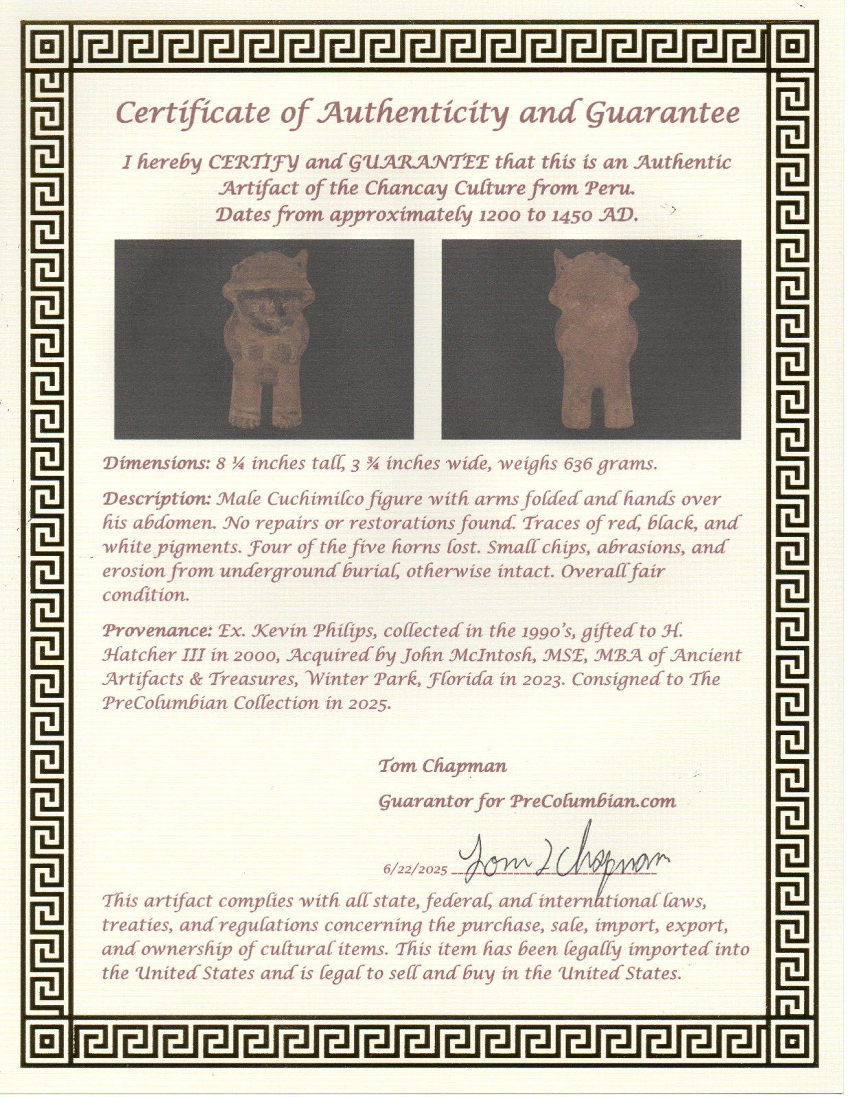 Dimensions: 8 ¼ inches tall, 3 ¾ inches wide, weighs 636 grams.Description: Male Cuchimilco figure with arms folded and hands over his abdomen. No repairs or restorations found. Traces of red, black, and white pigments. Four of the five horns lost. Small chips, abrasions, and erosion from underground burial, otherwise intact. Overall fair condition.Provenance: Ex. Kevin Philips, collected in the 1990’s, gifted to H. Hatcher III in 2000, Acquired by John McIntosh, MSE, MBA of Ancient Artifacts & Treasures, Winter Park, Florida in 2023. Consigned to The PreColumbian Collection in 2025.