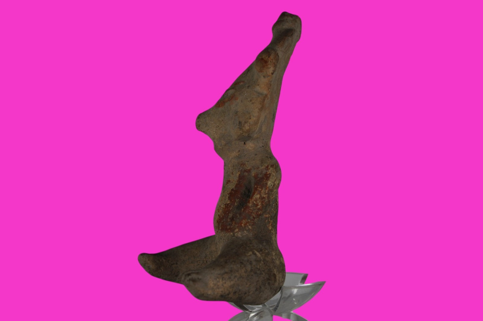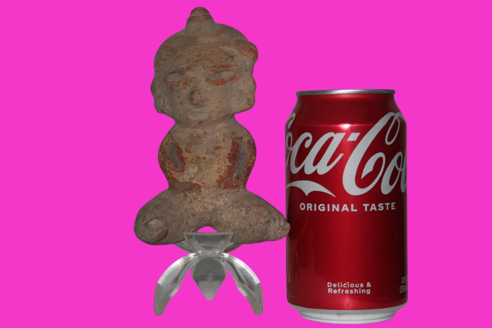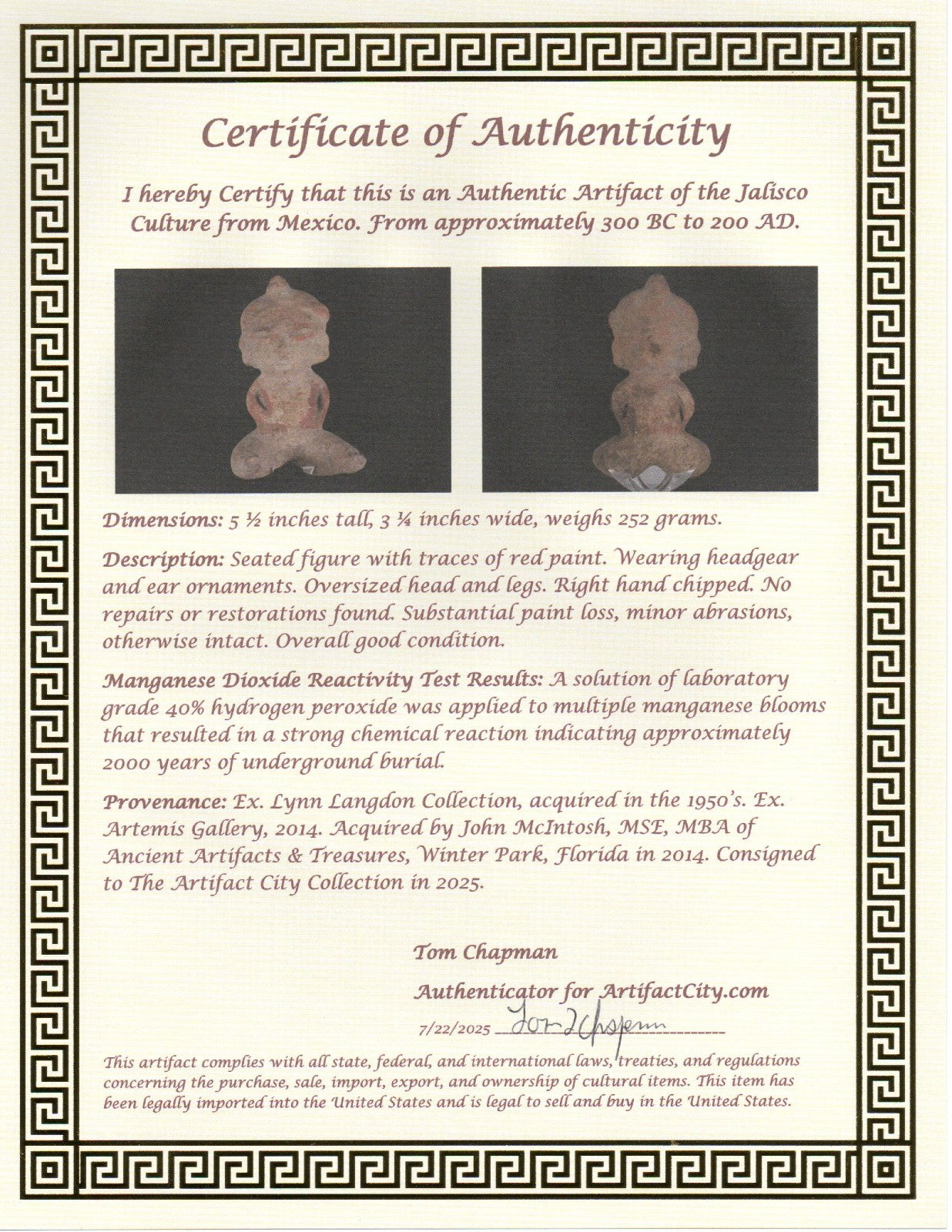 Dimensions: 5 ½ inches tall, 3 ¼ inches wide, weighs 252 grams. Description: Seated figure with traces of red paint. Wearing headgear and ear ornaments. Oversized head and legs. Right hand chipped. No repairs or restorations found. Substantial paint loss, minor abrasions, otherwise intact. Overall good condition. Manganese Dioxide Reactivity Test Results: A solution of laboratory grade 40% hydrogen peroxide was applied to multiple manganese blooms that resulted in a strong chemical reaction indicating approximately 2000 years of underground burial. Provenance: Ex. Lynn Langdon Collection, acquired in the 1950’s. Ex. Artemis Gallery, 2014. Acquired by John McIntosh, MSE, MBA of Ancient Artifacts & Treasures, Winter Park, Florida in 2014. Consigned to The Artifact City Collection in 2025.