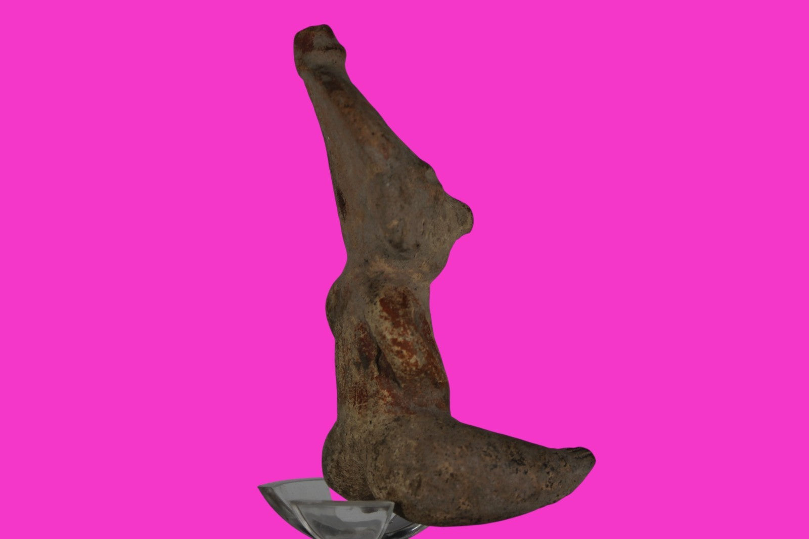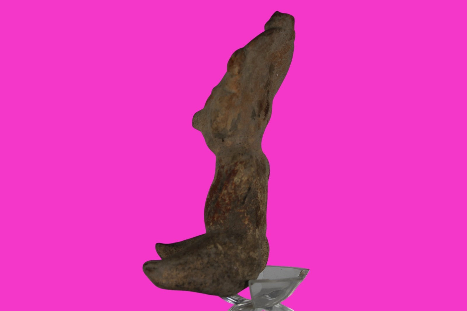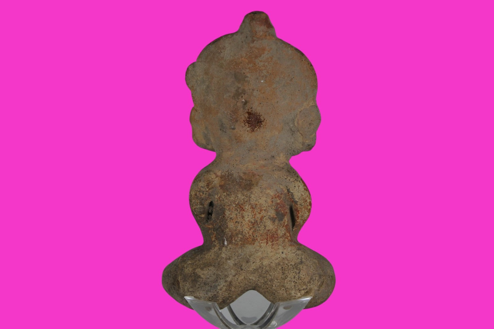 Dimensions: 5 ½ inches tall, 3 ¼ inches wide, weighs 252 grams. Description: Seated figure with traces of red paint. Wearing headgear and ear ornaments. Oversized head and legs. Right hand chipped. No repairs or restorations found. Substantial paint loss, minor abrasions, otherwise intact. Overall good condition. Manganese Dioxide Reactivity Test Results: A solution of laboratory grade 40% hydrogen peroxide was applied to multiple manganese blooms that resulted in a strong chemical reaction indicating approximately 2000 years of underground burial. Provenance: Ex. Lynn Langdon Collection, acquired in the 1950’s. Ex. Artemis Gallery, 2014. Acquired by John McIntosh, MSE, MBA of Ancient Artifacts & Treasures, Winter Park, Florida in 2014. Consigned to The Artifact City Collection in 2025.