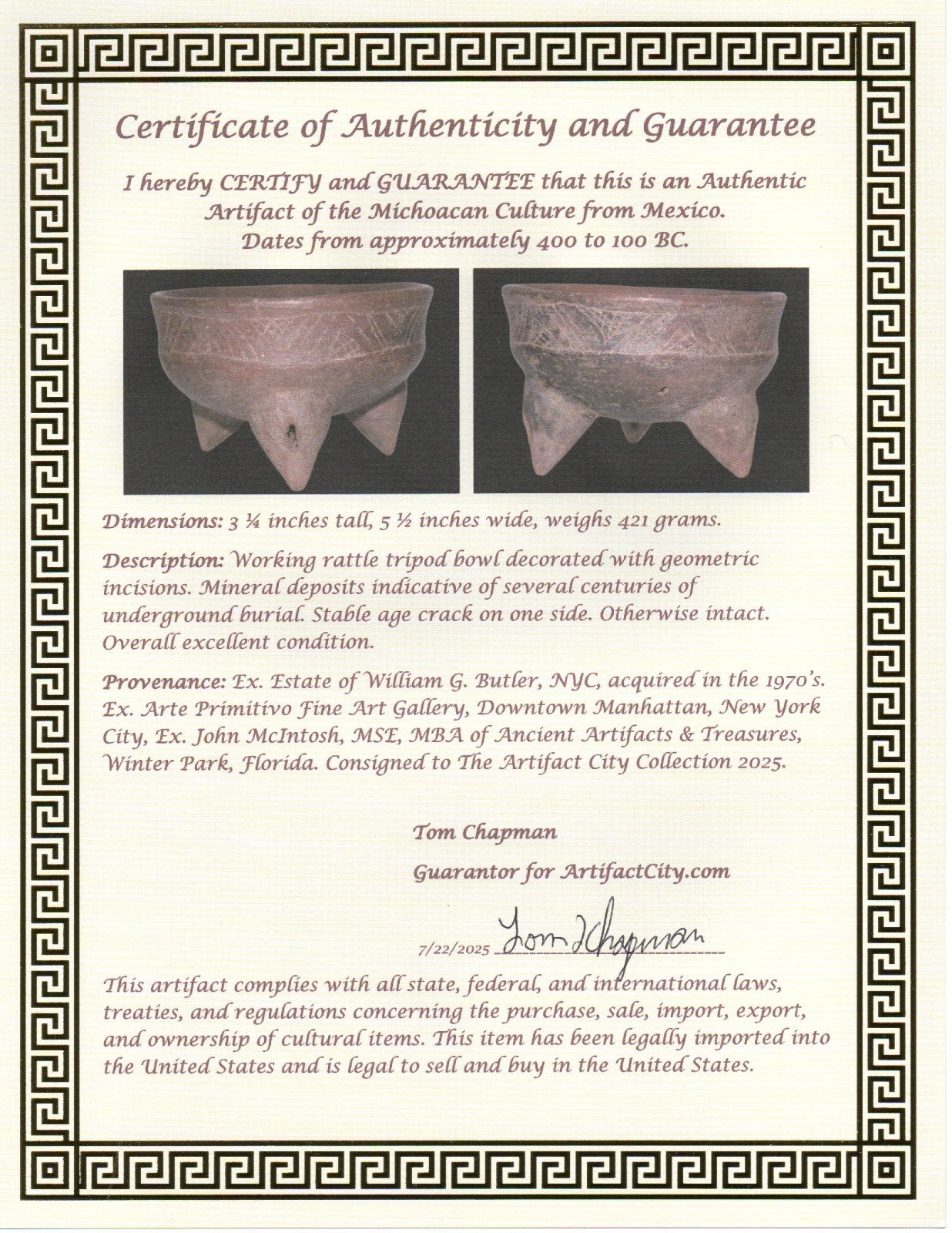 Dimensions: 3 ¼ inches tall, 5 ½ inches wide, weighs 421 grams.Description: Working rattle tripod bowl decorated with geometric incisions. Mineral deposits indicative of several centuries of underground burial. Stable age crack on one side. Otherwise intact. Overall excellent condition.Provenance: Ex. Estate of William G. Butler, NYC, acquired in the 1970’s. Ex. Arte Primitivo Fine Art Gallery, Downtown Manhattan, New York City, Ex. John McIntosh, MSE, MBA of Ancient Artifacts & Treasures, Winter Park, Florida. Consigned to The Artifact City Collection 2025.