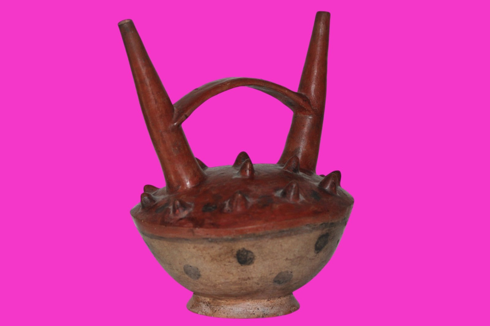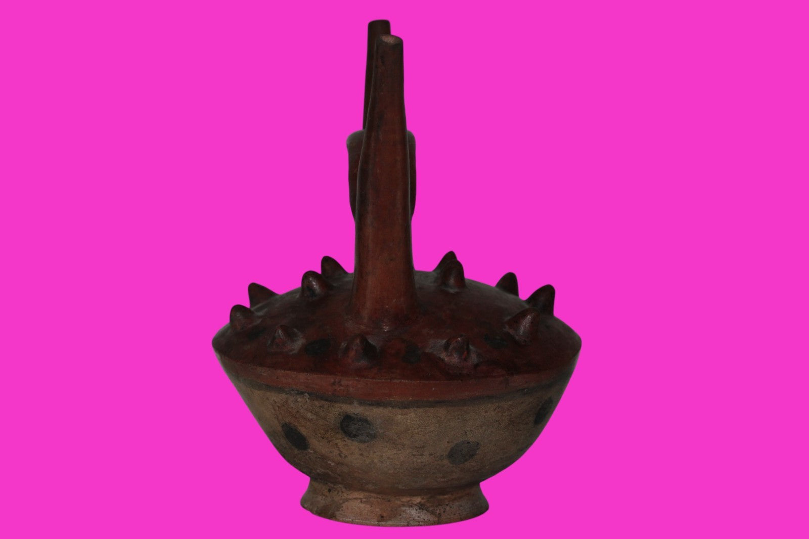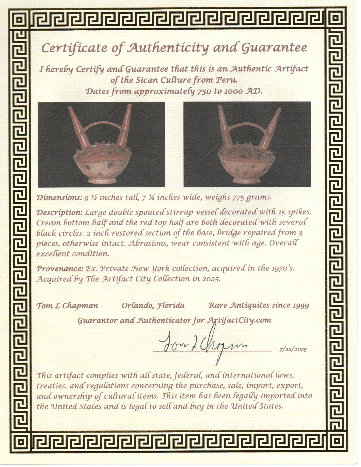 Dimensions: 9 ½ inches tall, 7 ¾ inches wide, weighs 775 grams. Description: Large double spouted stirrup vessel decorated with 15 spikes. Cream bottom half and the red top half are both decorated with several black circles. 2 inch restored section of the base, bridge repaired from 3 pieces, otherwise intact. Abrasions, wear consistent with age. Overall excellent condition. Provenance: Ex. Private New York collection, acquired in the 1970’s. Acquired by The Artifact City Collection in 2025.