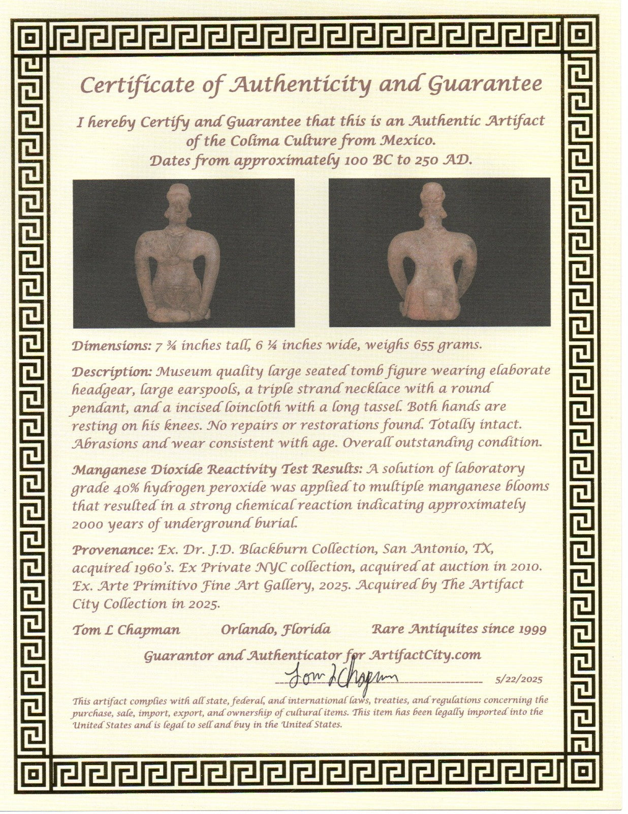 Dimensions: 7 ¾ inches tall, 6 ¼ inches wide, weighs 655 grams. Description: Museum quality large seated tomb figure wearing elaborate headgear, large earspools, a triple strand necklace with a round pendant, and a incised loincloth with a long tassel. Both hands are resting on his knees. No repairs or restorations found. Totally intact. Abrasions and wear consistent with age. Overall outstanding condition. Manganese Dioxide Reactivity Test Results: A solution of laboratory grade 40% hydrogen peroxide was applied to multiple manganese blooms that resulted in a strong chemical reaction indicating approximately 2000 years of underground burial. Provenance: Ex. Dr. J.D. Blackburn Collection, San Antonio, TX, acquired 1960’s. Ex Private NYC collection, acquired at auction in 2010. Ex. Arte Primitivo Fine Art Gallery, 2025. Acquired by The Artifact City Collection in 2025.