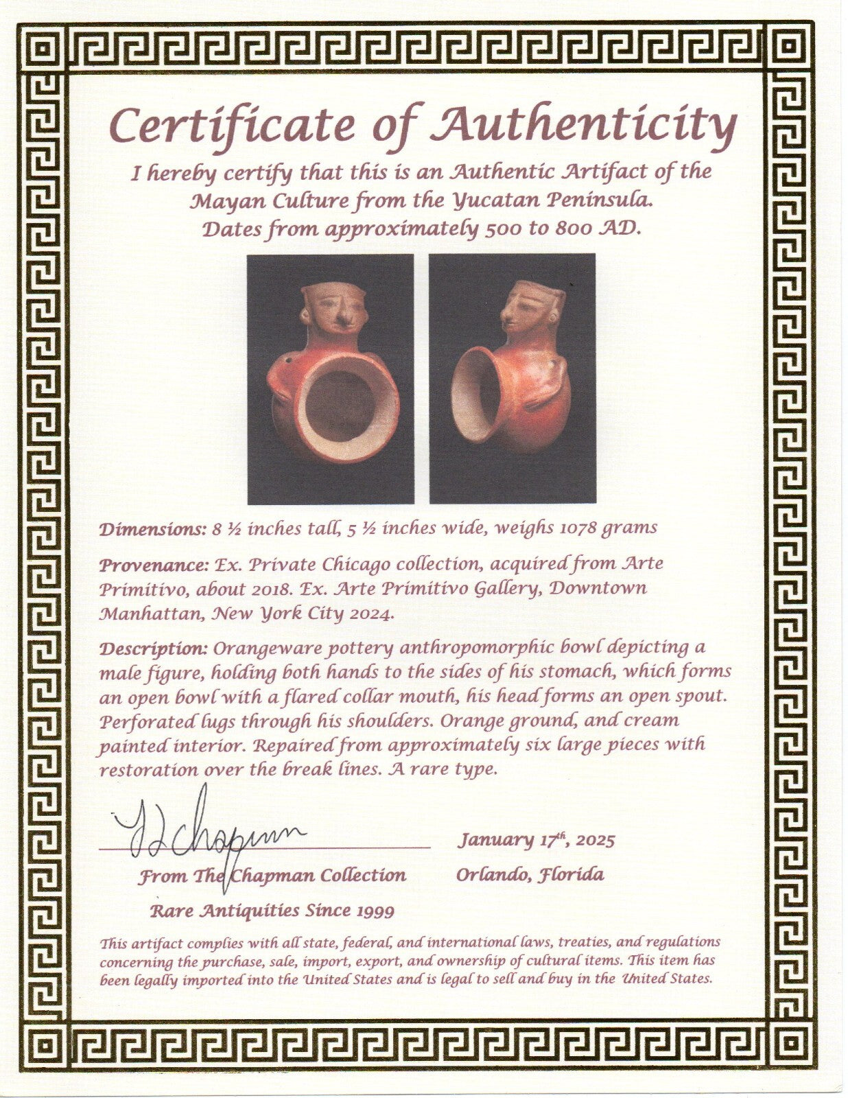 Excellant Condition. Orangeware pottery anthropomorphic bowl depicting a male figure, holding both hands to the sides of his stomach, which forms an open bowl with a flared collar mouth, his head forms an open spout. Perforated lugs through his shoulders. Orange ground, and cream painted interior. Repaired from approximately six large pieces with restoration over the break lines. A rare type.